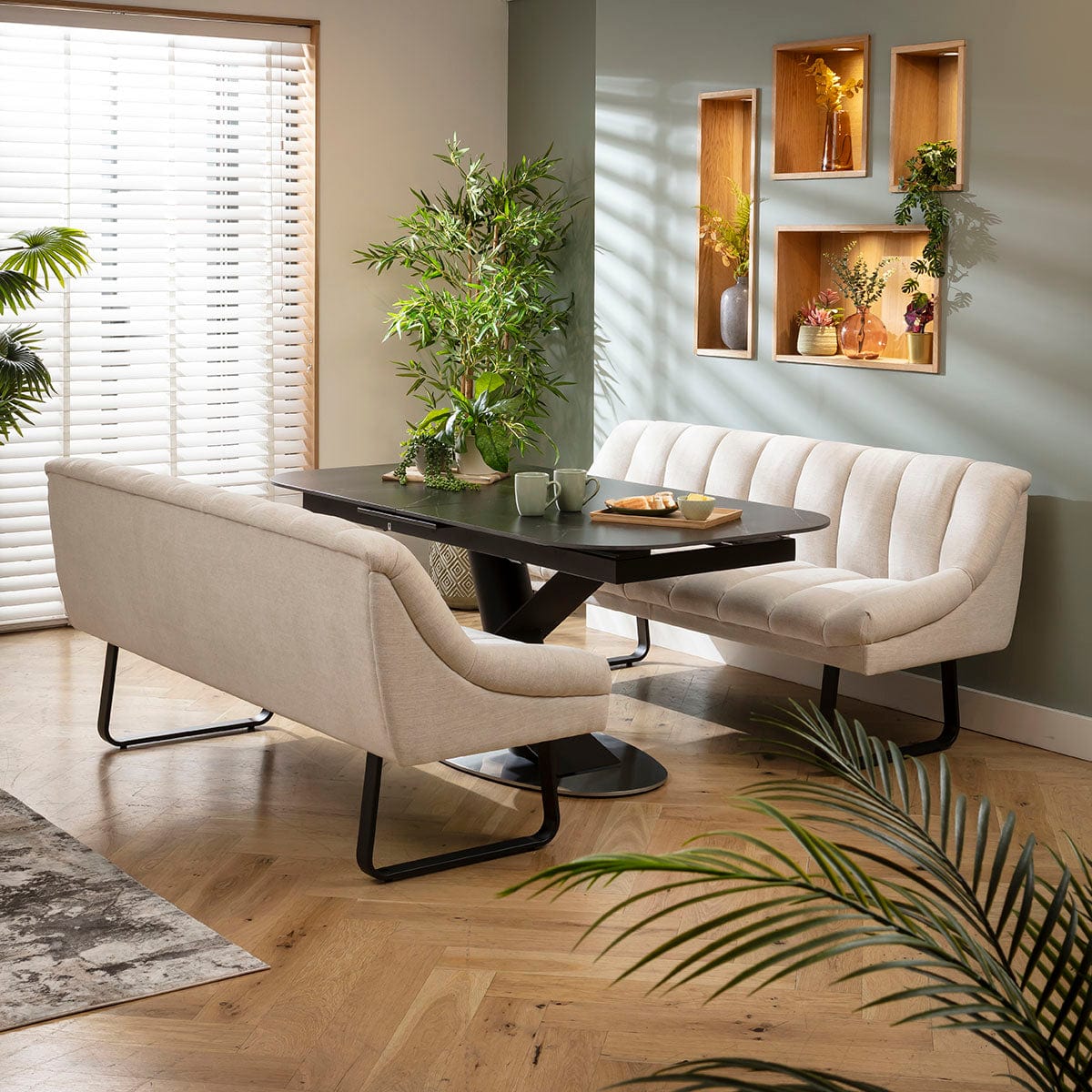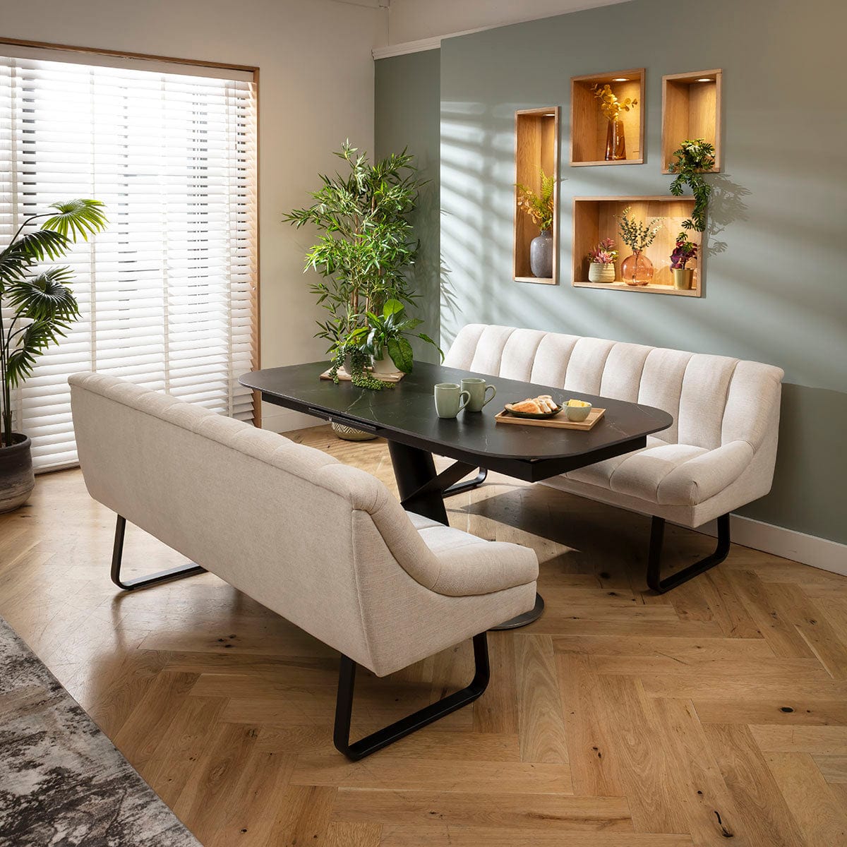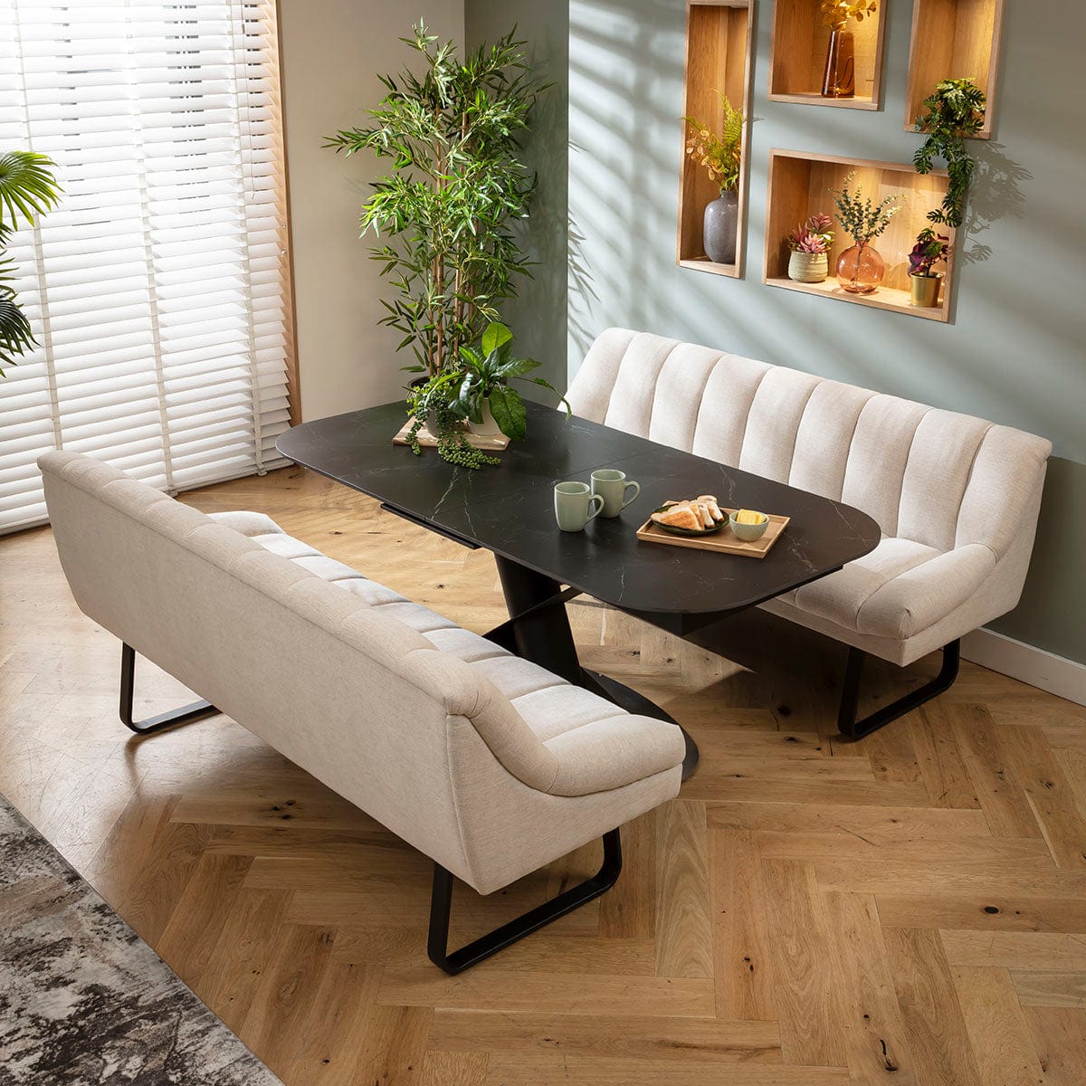 This 6 seater bench dining set includes this extendable ceramic marble dining table embellishing a bold pedestal with a geometric design, with two luxury Harvey dining benches with backrests in super-soft stone fabric. This modern dining set is crafted for practicality and comfort.