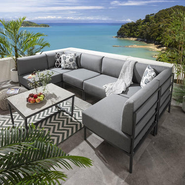 Experience the versatility of the Alfie outdoor modular U-shape corner sofa set, made of seven pieces, it's a 288cm x 144cm modern U shape garden sofa with a coordinating coffee table. Crafted with weather-resistant aluminium frames in an elegant grey finish and super-thick cushions, upholstered in premium grey fabric.
