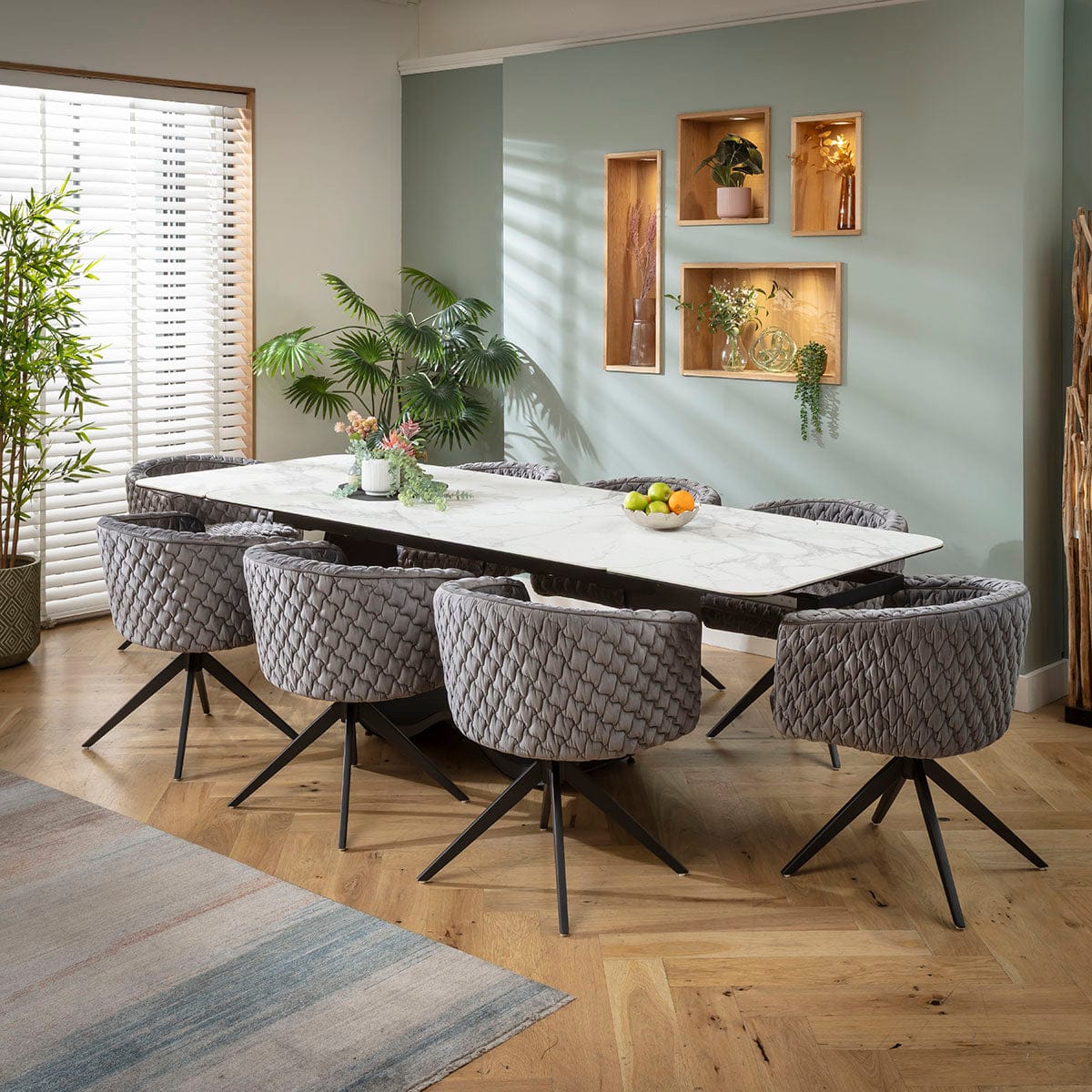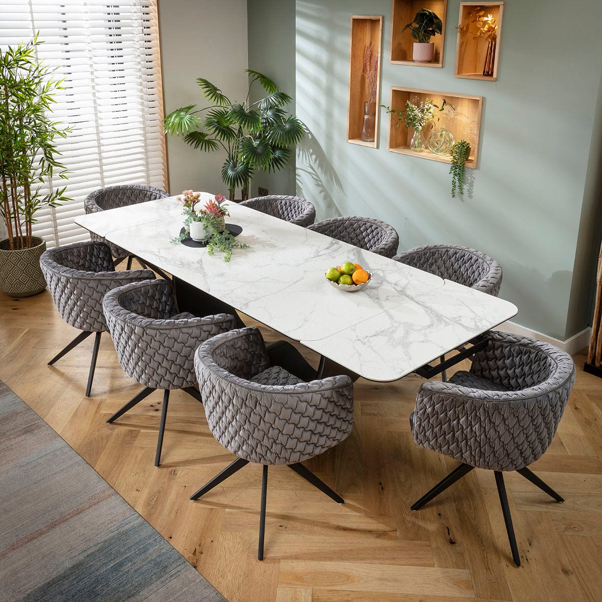This 8 seater dining table and chair set includes an extendable dining table combining a white ceramic top with a metal pedestal base, with swivel dining chairs with arms for added comfort and grey velvet upholstery. This modern dining set is crafted for durability and comfort.