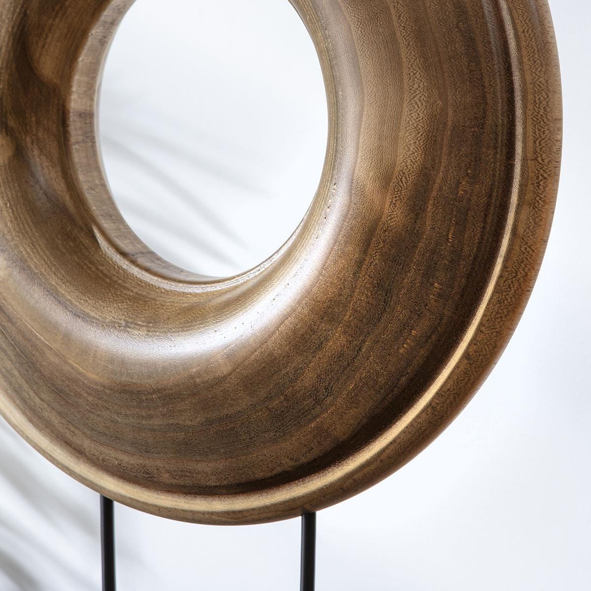 Elevate your decor with this elegant wooden disc ornament. Crafted from natural wood with a smooth finish, it features a minimalist design with a central hole. Mounted on a sleek black metal base, it blends timeless style and modern charm, perfect for any setting.