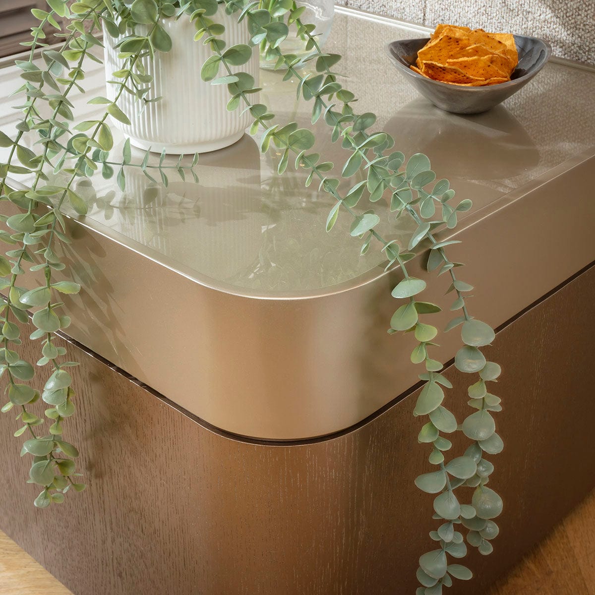 Crafted with precision, this square side table features a tempered glass top with a subtle lip for both style and practicality. The upper frame showcases a smooth champagne gold painted finish, while the oak veneer base highlights natural grain detail. Bold, modern, and tactile, it embodies true luxury and statement design.