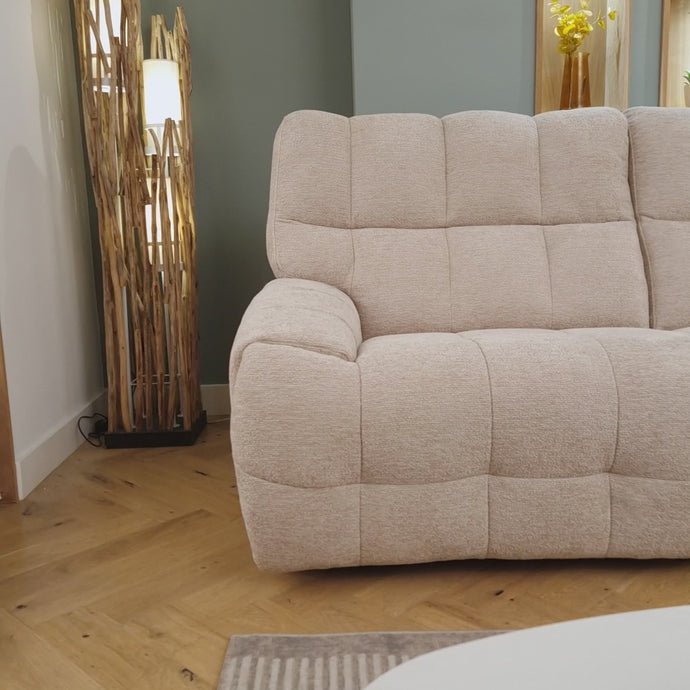 This power recliner sofa is designed as a modular recliner sofa set, with eight sections: left and right armed reclining seats, a middle reclining seat, plus three middle sections and two corner units. Measuring 390x300cm (allow a tolerance of 5cm each way for fabric variation), it is upholstered in premium beige chenille fabric with soft-touch texture. Supportive cushioning ensures long-lasting comfort. Reclining sections require 30cm clearance from the wall. Please note the packaging dimensions - armed sections 117cm x 89cm x 87cm, middle sections 86cm x 86cm x 78cm, corner section 127cm x 105cm x 76cm - which should be considered for delivery and access.