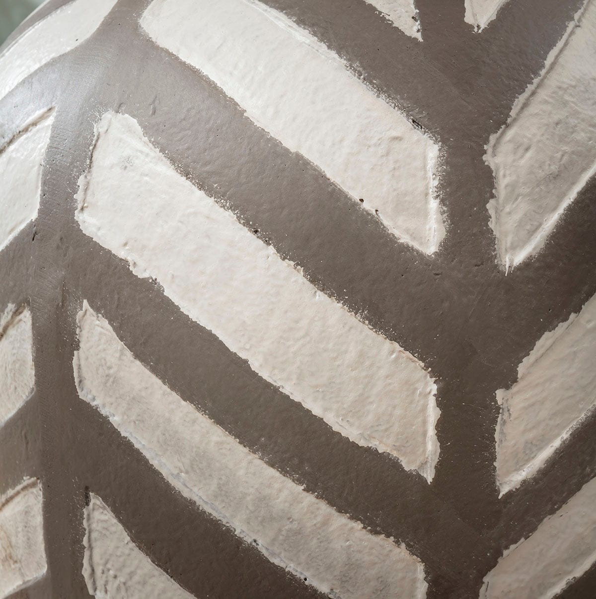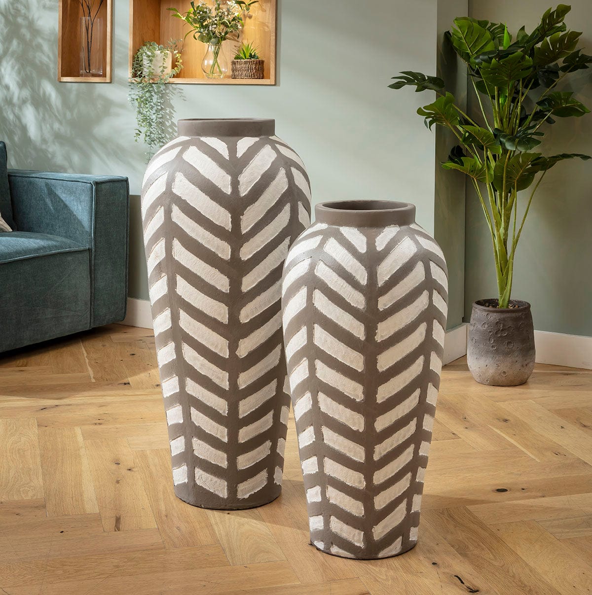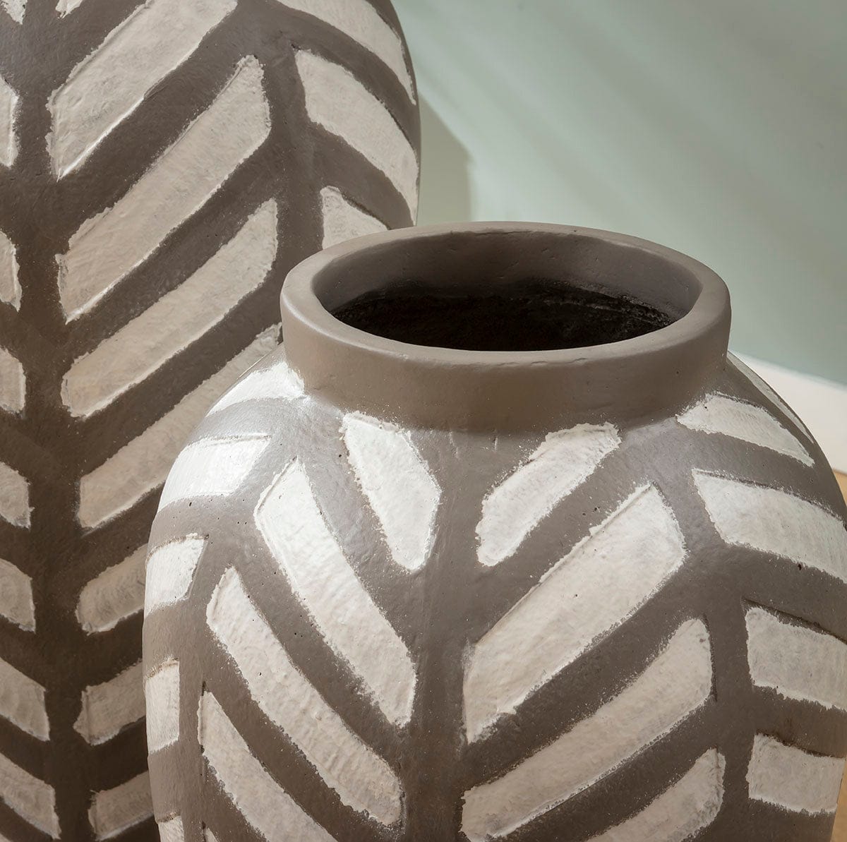 This set of 2 decorative pots features handmade pottery craftsmanship with a white base and grey zebra-style stripes resembling chevrons. Each large pot showcases a rustic painted finish, with one slightly bigger for visual balance, delivering high-quality artistry and distinctive styling.