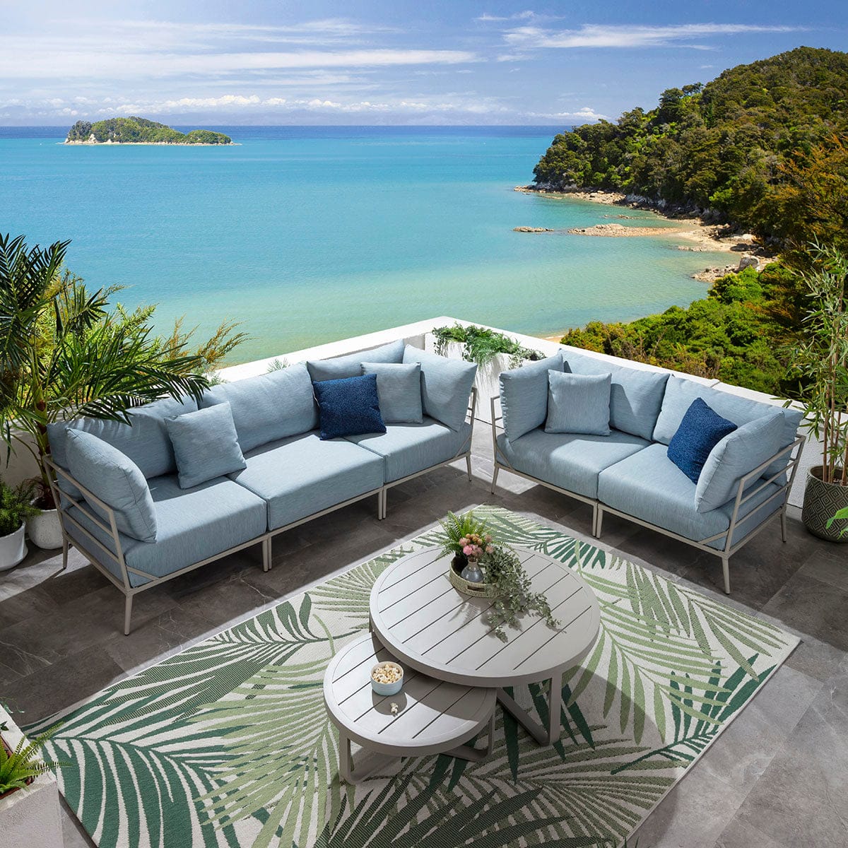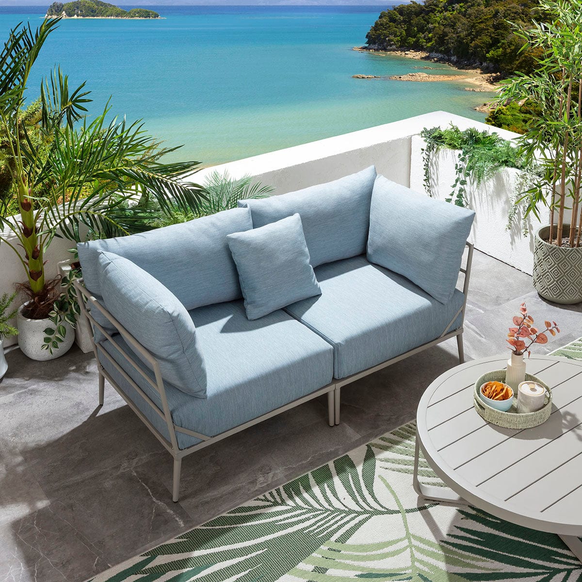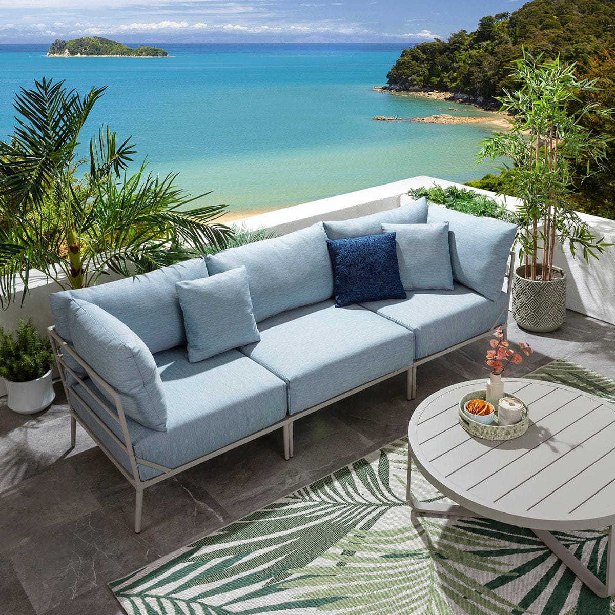 This modular outdoor sofa set in sky blue delivers a refined balance of comfort, scale, and durability for contemporary spaces. Designed as modern garden sofas with modular flexibility, they adapt effortlessly to stylish outdoor spaces of all sizes. Featuring aluminium construction and generous cushioning, this metal garden sofa set elevates patios with the presence of a luxury garden couch built for lasting outdoor living.