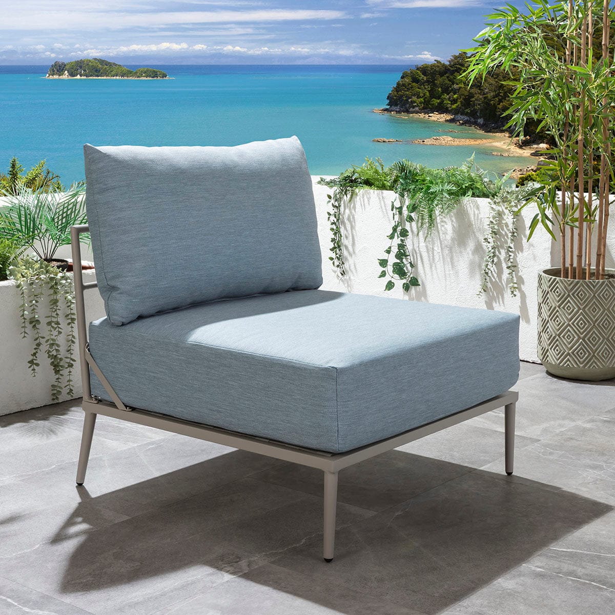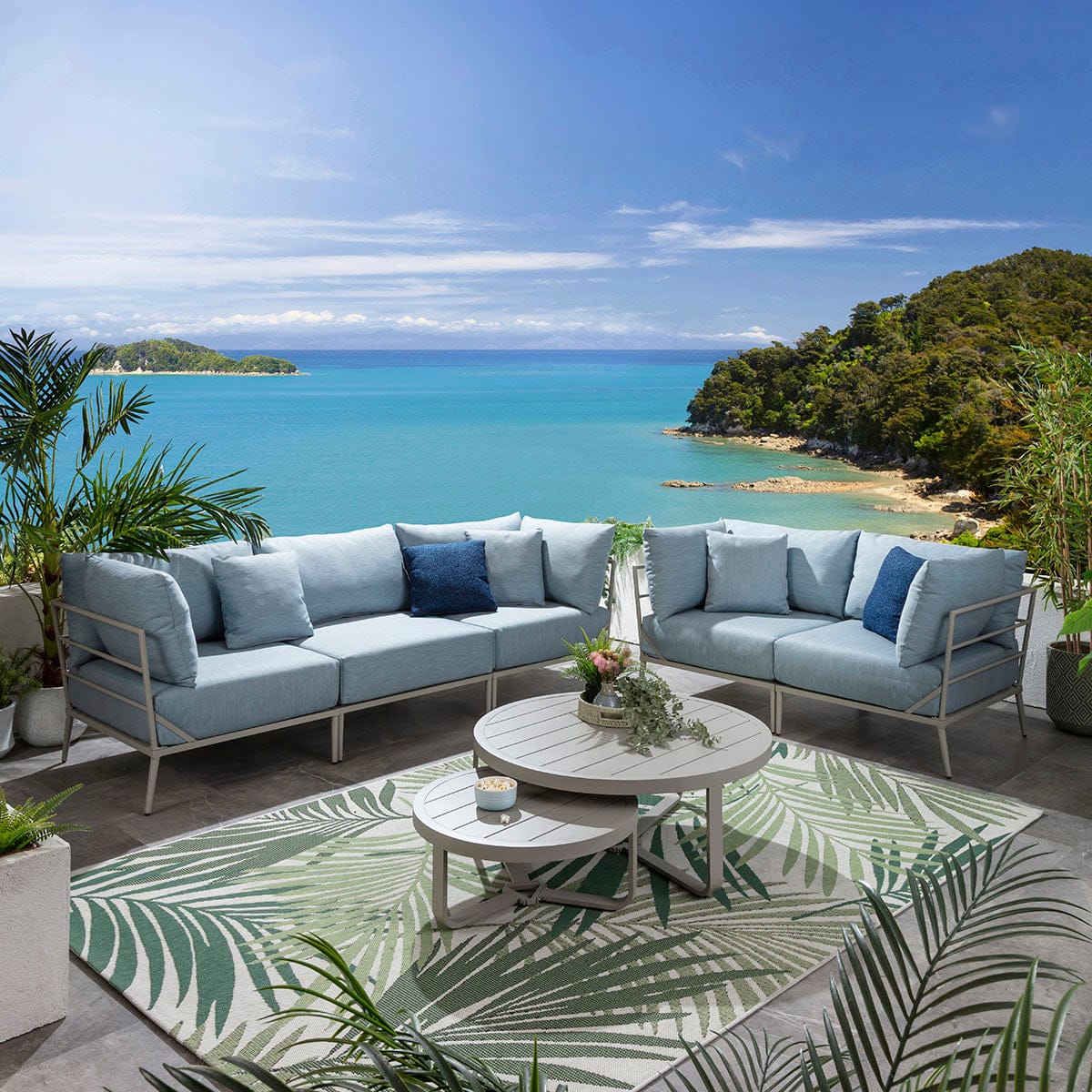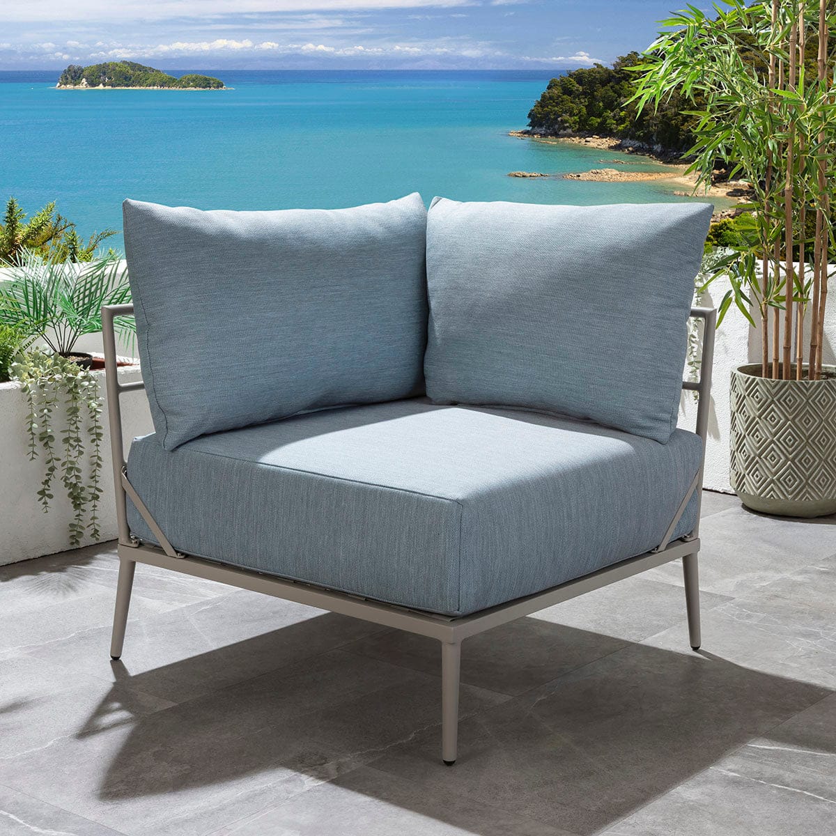 This modular outdoor sofa set in sky blue delivers a refined balance of comfort, scale, and durability for contemporary spaces. Designed as modern garden sofas with modular flexibility, they adapt effortlessly to stylish outdoor spaces of all sizes. Featuring aluminium construction and generous cushioning, this metal garden sofa set elevates patios with the presence of a luxury garden couch built for lasting outdoor living.