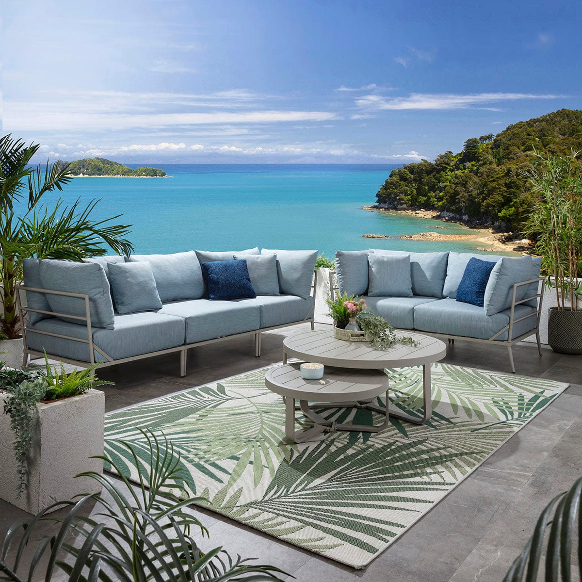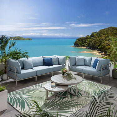 From the Cleo collection, this modern sofa set blends bold styling with season-ready construction. Slim grey aluminium frames form a durable base, while generous modular sections enhance layout flexibility. Deep cushions in textured sky blue outdoor fabric deliver a comfortable 44cm seat height, with 20cm thick base cushions and 23cm thick supportive back cushions. Storing cushions when not in use is recommended.