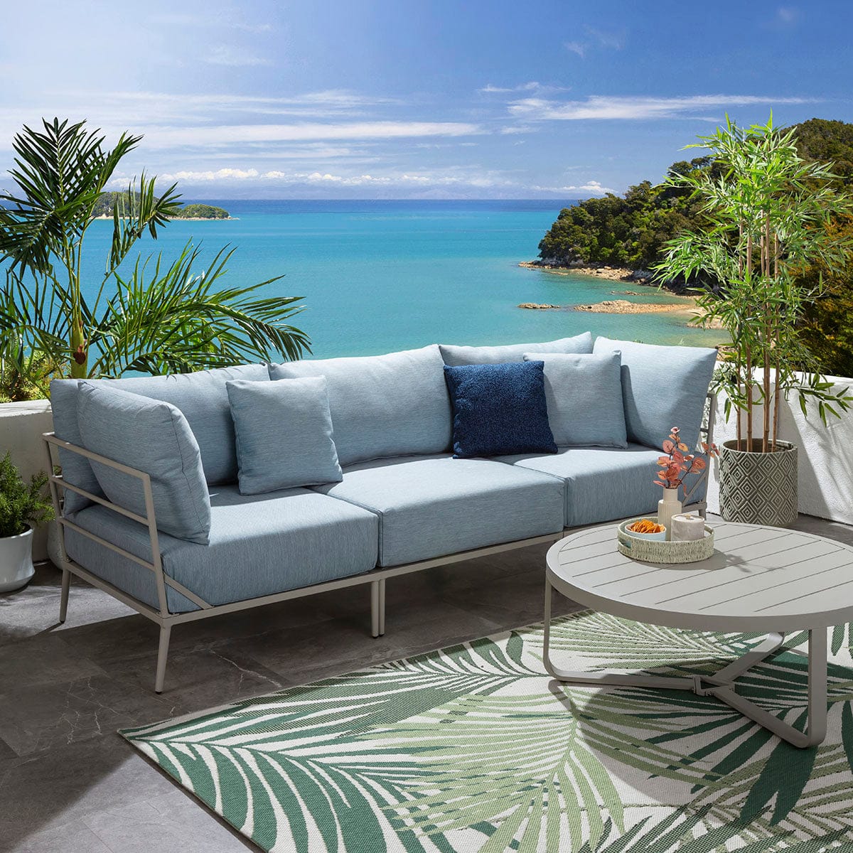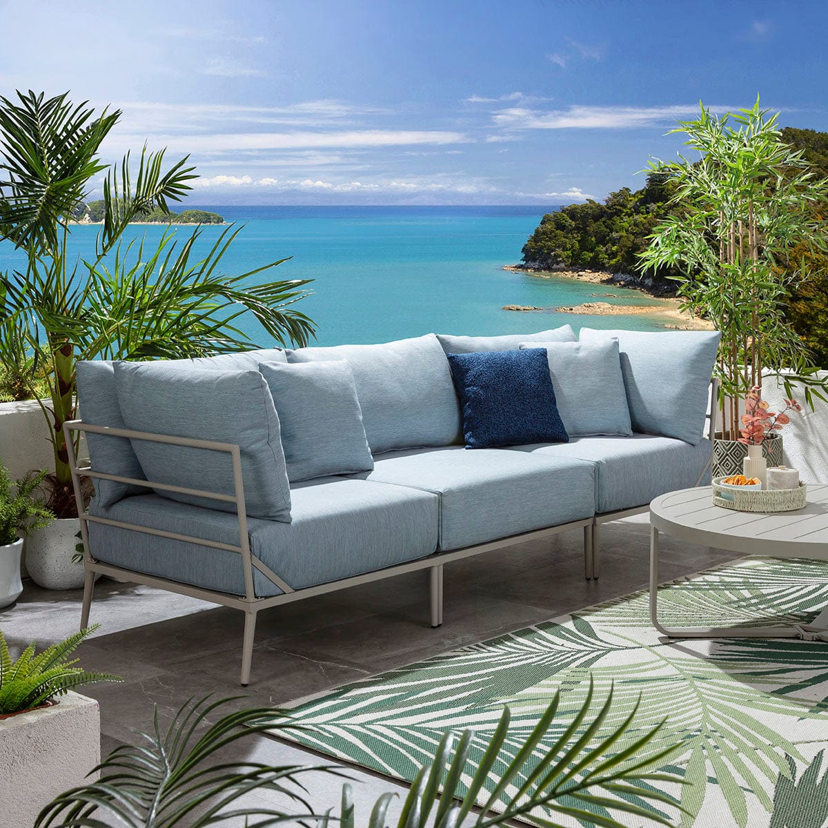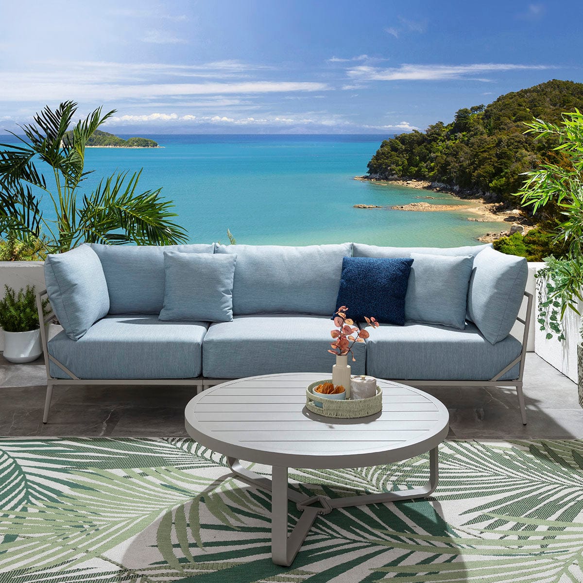 This modular outdoor sofa set in sky blue delivers a refined balance of comfort, scale, and durability for contemporary spaces. Designed as a modern garden sofa with modular flexibility, it adapts effortlessly to stylish outdoor spaces of all sizes. Featuring aluminium construction and generous cushioning, this metal garden sofa elevates patios with the presence of a luxury garden couch built for lasting outdoor living.