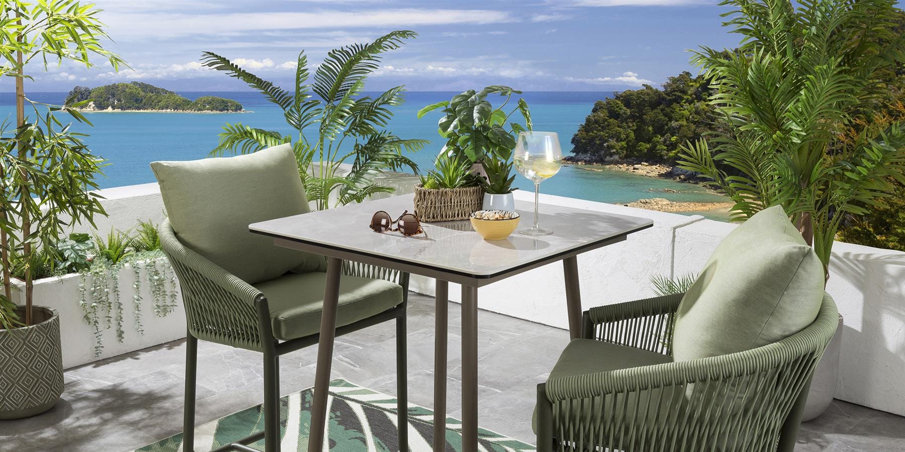 This 2 seater garden bar set includes a square garden high bar table featuring a ceramic marble top, on a beige aluminium metal frame, with green rope-back bar stools, featuring a back cushion for an extra layer of luxury comfort. This outdoor bar table set is crafted for durability and comfort.