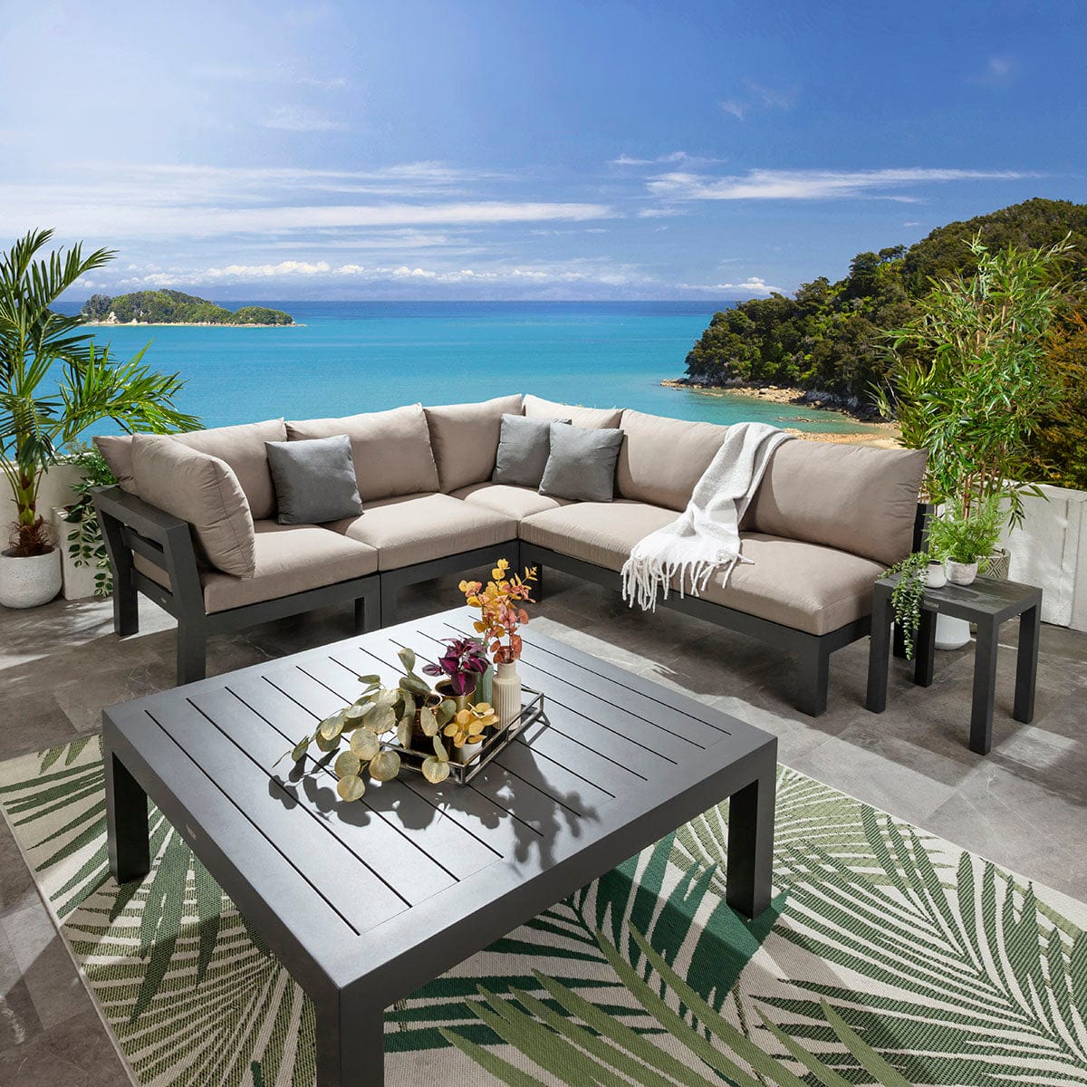 Crafted from high-quality aluminium, our all-weather outdoor sofas are built to withstand the elements. Aluminium is lightweight, rust-resistant, and incredibly durable—making it the ideal material for modern garden corner sofas. Paired with plush, luxurious cushions, our outdoor seating solutions provide superior comfort. Simply store the cushions when not in use, and the frames can stay outside, uncovered, all year round. Discover our Alfie & Zara Modular Sofas—effortless maintenance with timeless appeal.