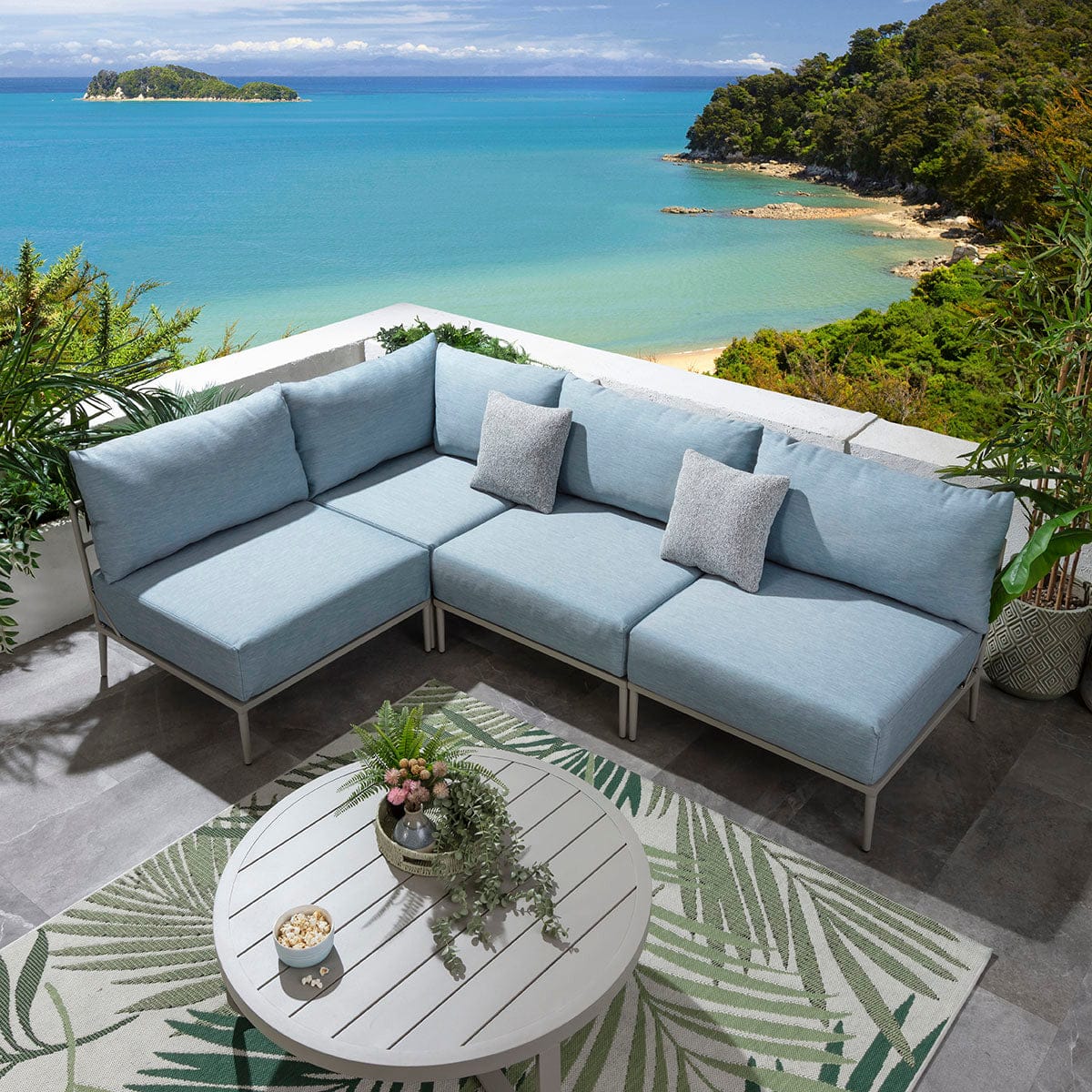 This modular outdoor corner sofa in sky blue delivers a refined balance of comfort, scale, and durability for contemporary spaces. Designed as a modern garden corner sofa with modular flexibility, it adapts effortlessly to stylish outdoor spaces of all sizes. Featuring aluminium construction and generous cushioning, this L-shaped garden sofa elevates patios with the presence of a luxury garden couch built for lasting outdoor living.