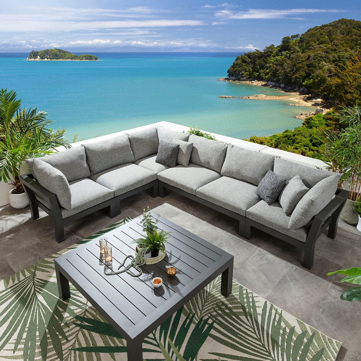 Designed for statement gardens, this garden corner sofa delivers contemporary comfort at scale. The L-shaped garden sofa layout, aluminium construction, and modular format create a refined grey garden sofa set for entertaining. Combining the presence of a luxury outdoor sofa with the resilience of a metal garden sofa, it redefines the modern outdoor garden sofa experience.