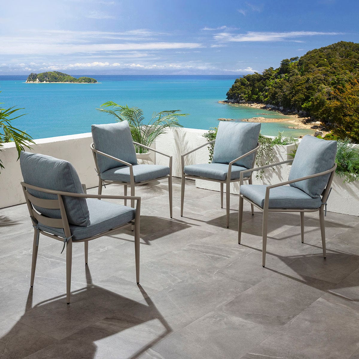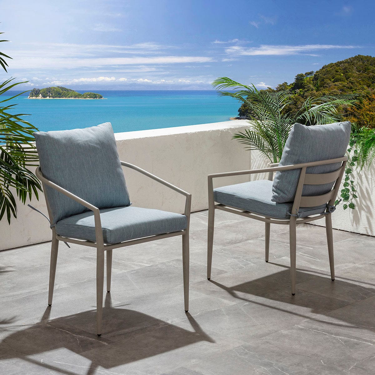 Upgrade your patio with our aluminium garden dining chairs, crafted for contemporary outdoor living. These modern outdoor dining chairs combine durable aluminium frames with weather-ready design for effortless use year-round. Finished in almond grey and styled with blue dining chair cushions, they deliver comfort, resilience, and refined design for stylish garden dining.