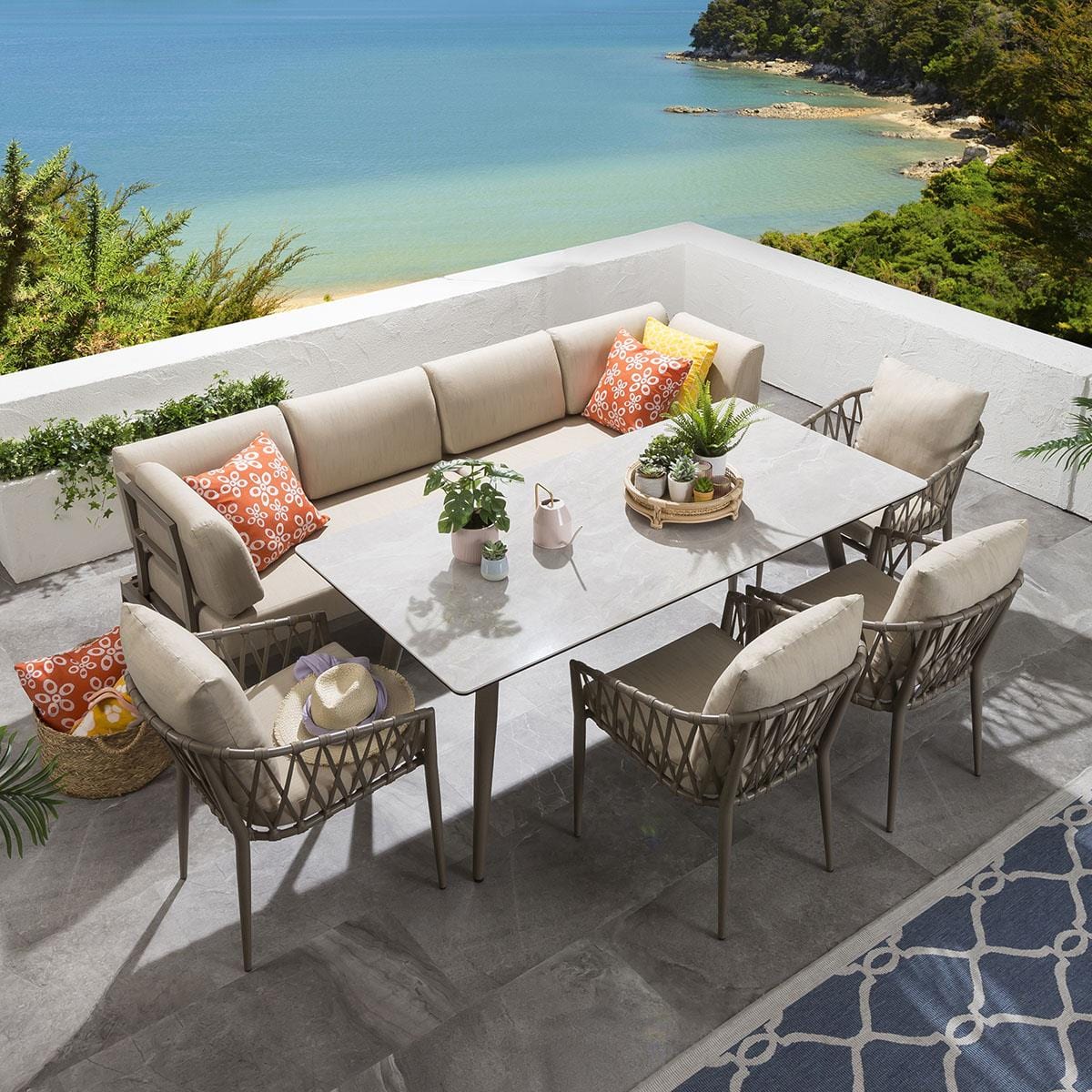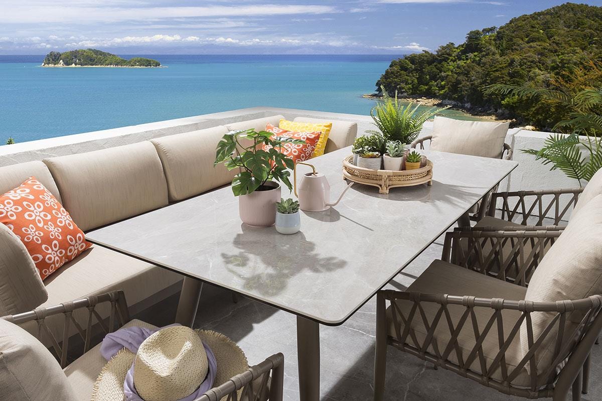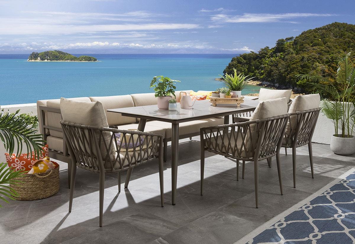The Ada outdoor bench features a sleek modern design, crafted from durable aluminium with premium cushions. Benches clip together for flexible configurations and seat two people each. The Verity chairs boast a solid welded aluminium frame and a unique fabric weave backrest, paired with super-comfortable cushions.
