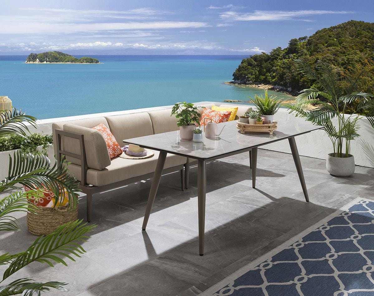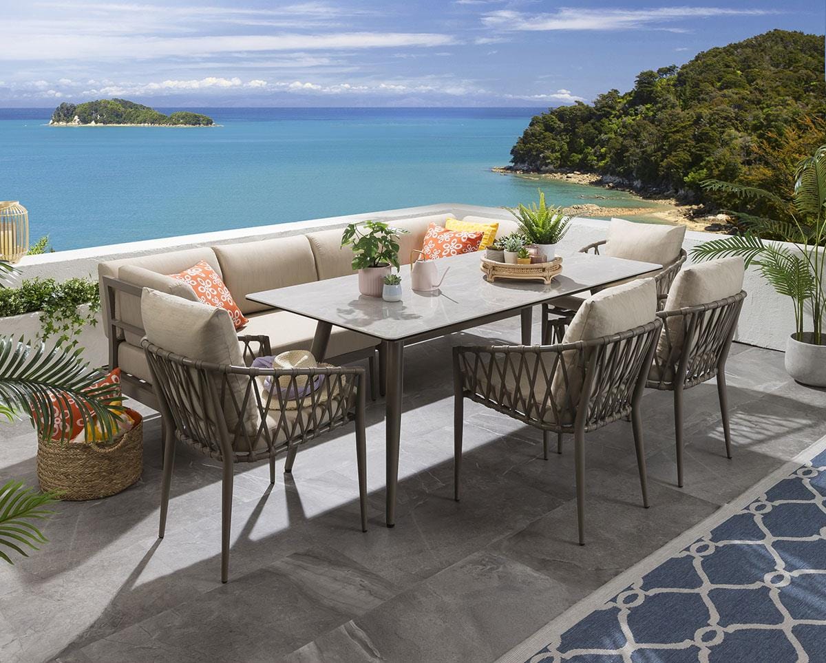 Upgrade your outdoor space with this 8-seater all-weather garden bench dining set, featuring the stylish Ada bench, Verity chairs, and the Portals Ceramic dining table. Crafted from high-quality aluminium with a premium beige finish, this modern outdoor table and chairs garden dining set is built to last season after season.