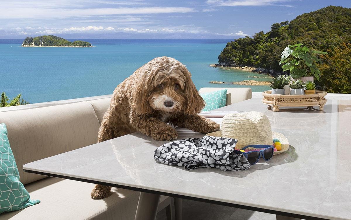 This S2 garden table set includes 2 Ada bench sections, 4 Verity chairs, and a Portals outdoor dining table. Protective covers are included for added longevity, shielding from tree sap, bird mess, and debris. Cushions should be stored when not in use for maximum durability.