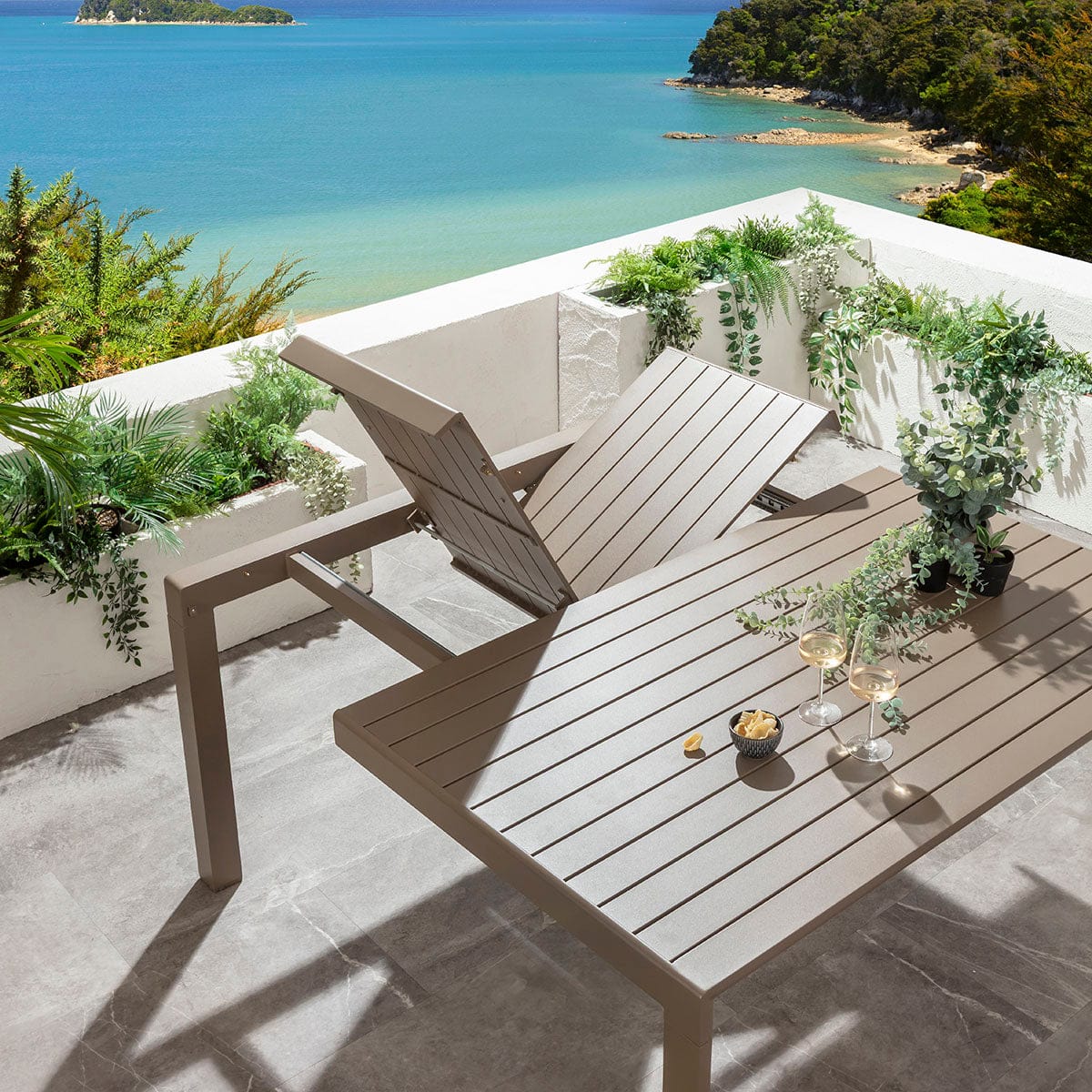 The Atlas extending outdoor dining table in premium beige, designed for flexible entertaining. This large modern garden dining table measures 97cm x 149cm when closed, comfortably seating six. Extend it to a 149cm square 8 seater outdoor table in under 30 seconds: simply unlatch, pull out the hidden leaf, fold, and secure. A modern slatted top, adjustable feet, rust-proof aluminium frame, and beige finish deliver bold elegance. It's ideal for any modern outdoor dining space - built for stylish gatherings.