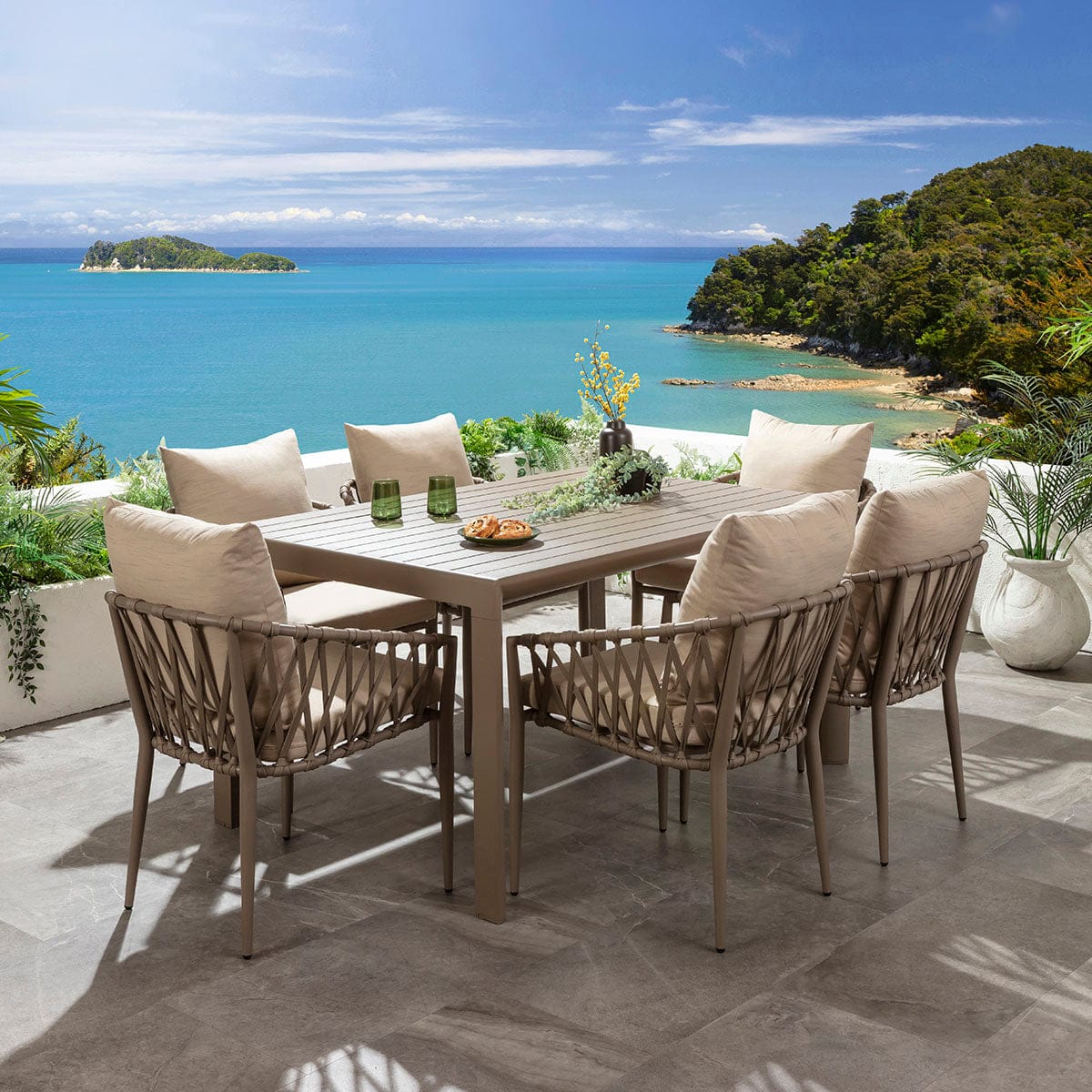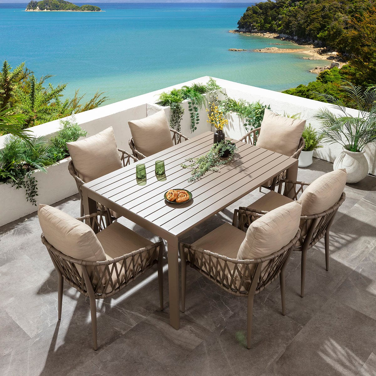 This 6 seater garden dining table and chairs set includes a beige extending dining table designed for summer living, crafted from all-weather aluminium, with beige rope garden dining chairs made from aluminium, making them weather-resistant for outdoor use. This outdoor dining set is crafted for durability and comfort.