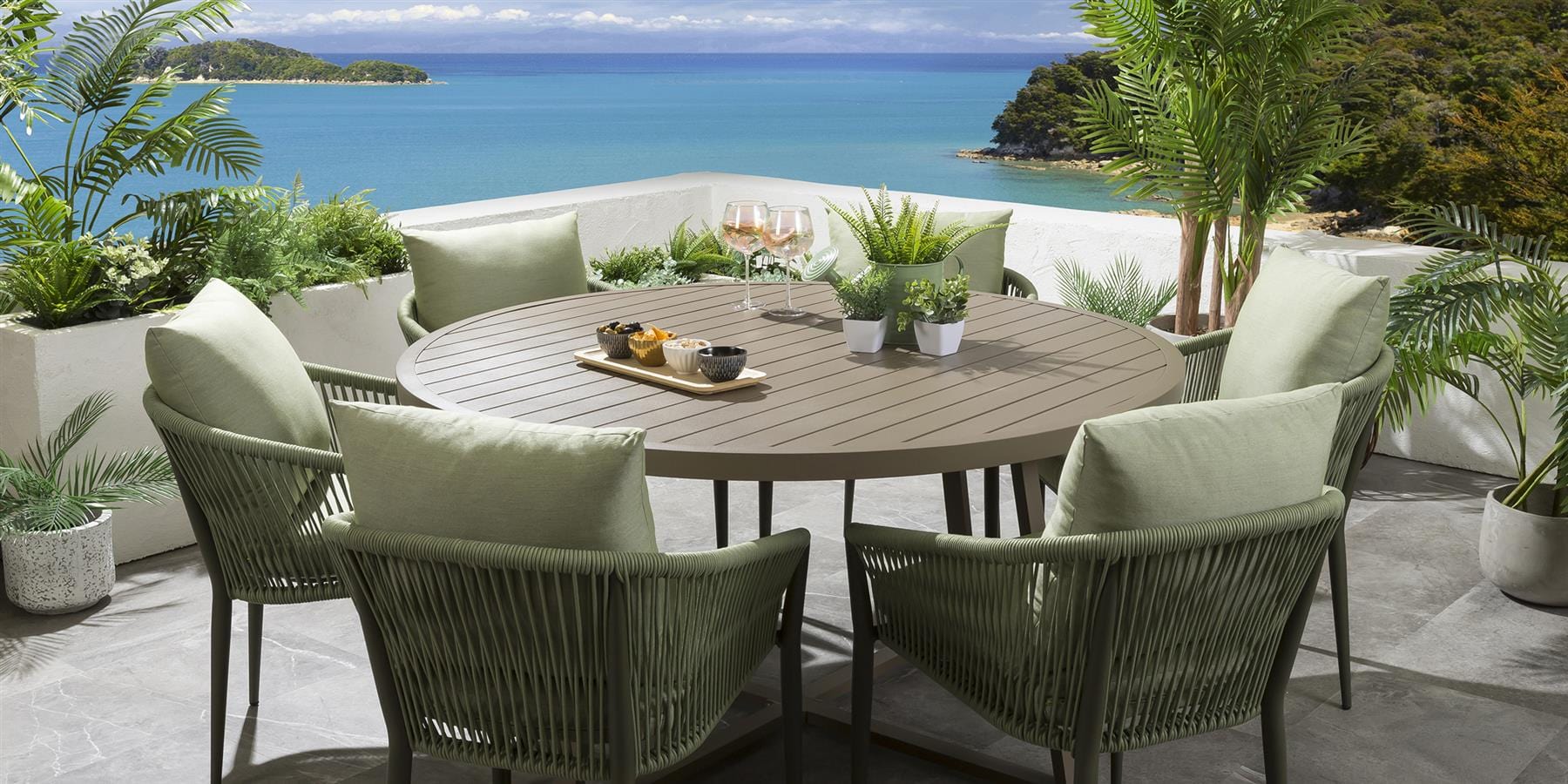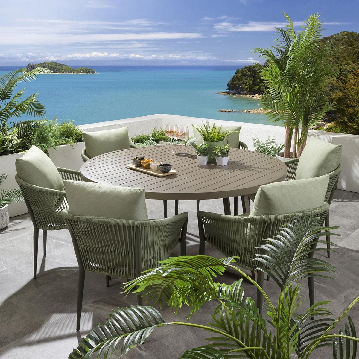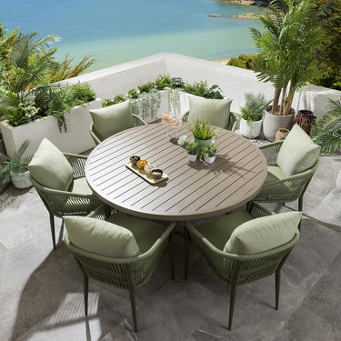 This 6 seater garden dining table and chairs set includes a round full aluminum dining table in a premium beige finish and it's simple, modern aesthetic, with green rope garden dining chairs made from aluminium, making them weather-resistant for outdoor use. This outdoor dining set is crafted for durability and comfort.