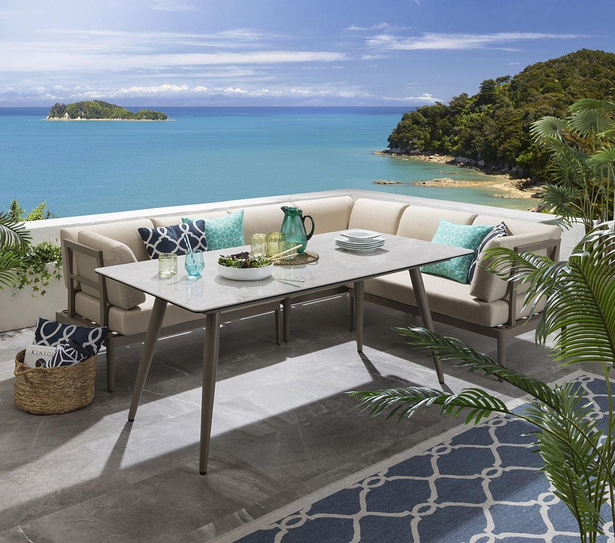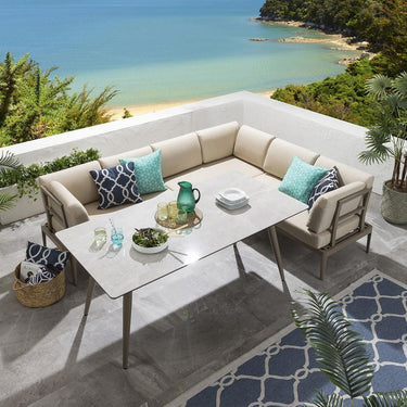 Upgrade your outdoor space with this 5-seater all-weather garden bench dining set, featuring the stylish Ada bench and the Portals Ceramic dining table. Crafted from high-quality aluminium with a premium beige finish, this modern outdoor table and chairs garden dining set is built to last season after season.