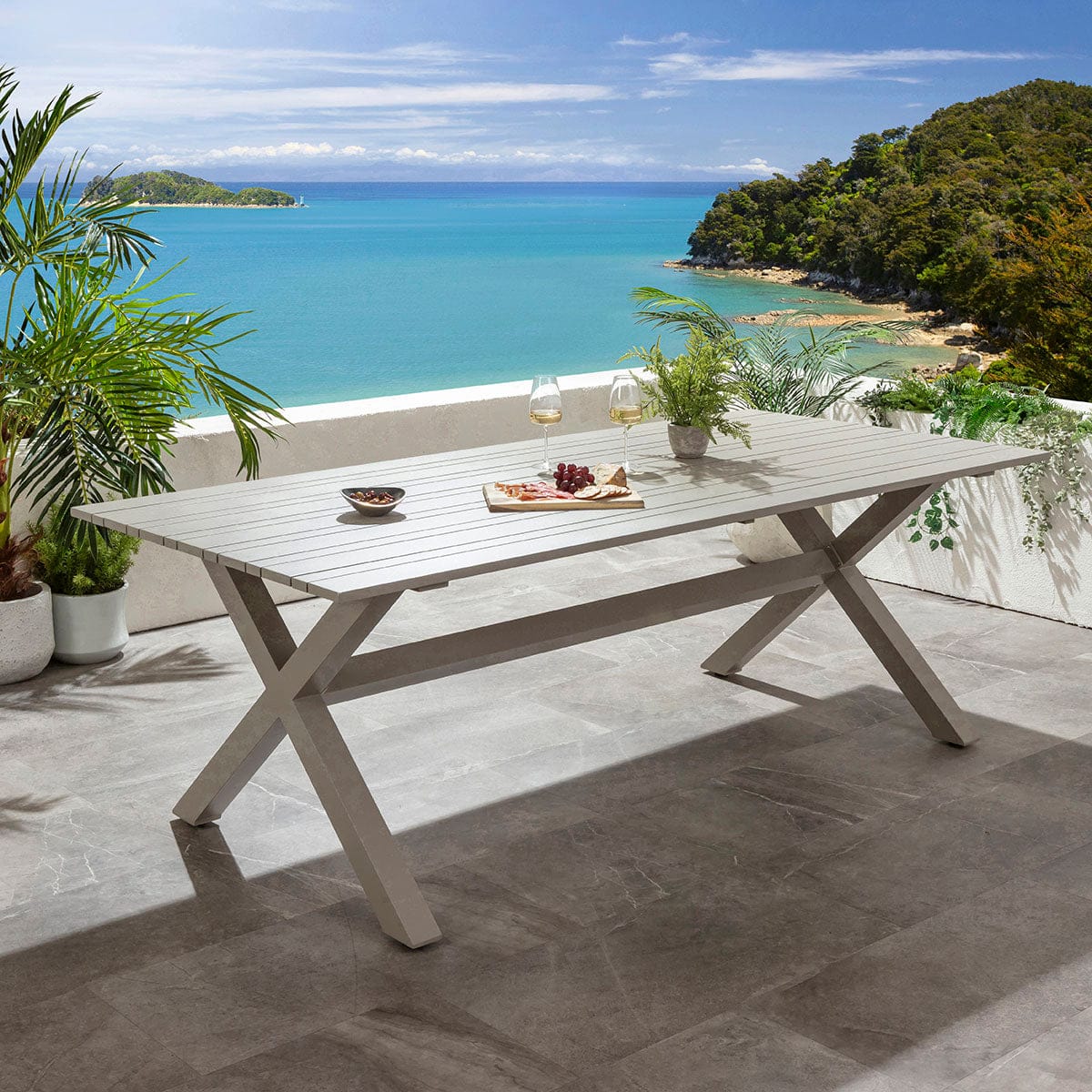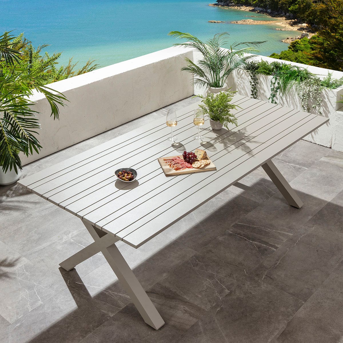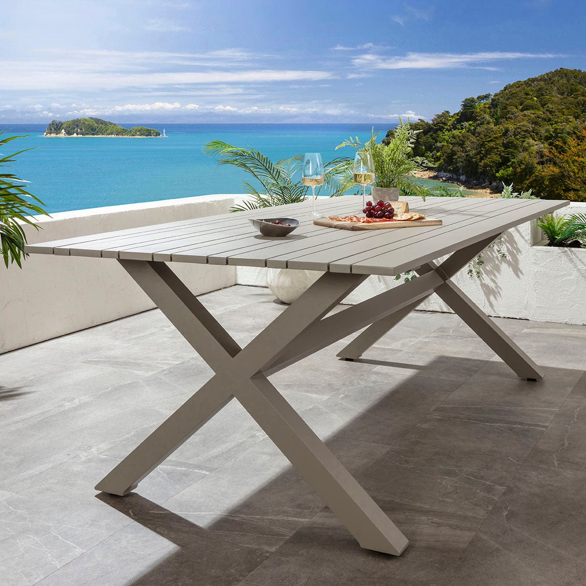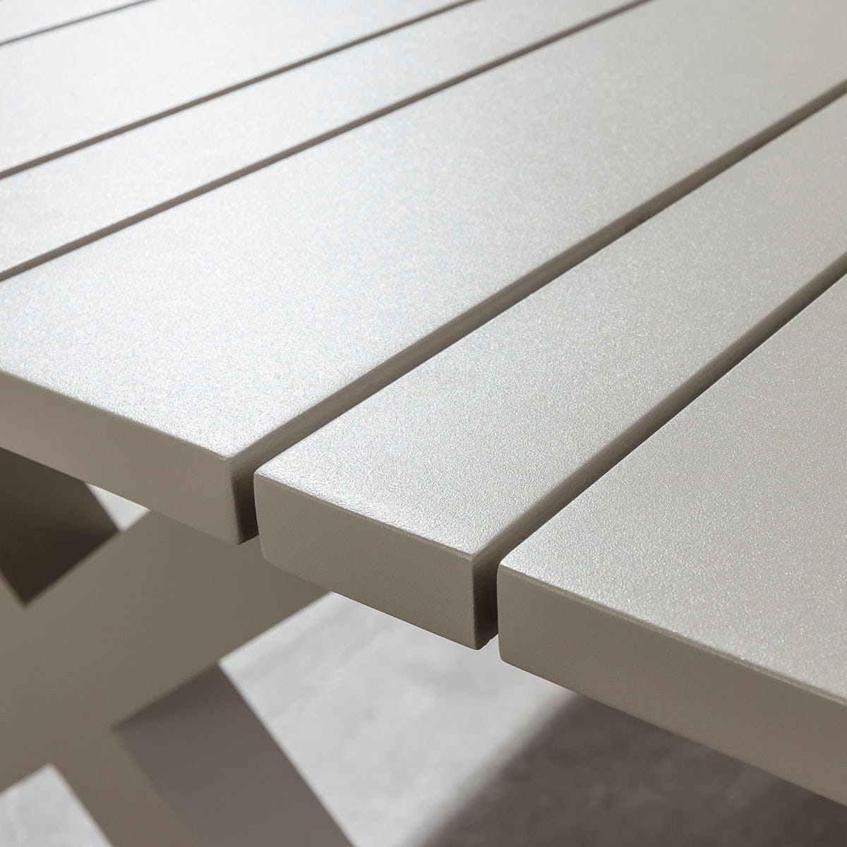 The Saturn table is a large rectangular table measuring 220cm x 106cm, offering generous space as an 8 seater outdoor table. Farmhouse-inspired X-legs support a distinctive slatted top, blending bold modern structure with refined detailing. Fully crafted from weather proof aluminium, it will not rust, and features a premium crushed-almond grey powder-coated finish - an elegant colourway.