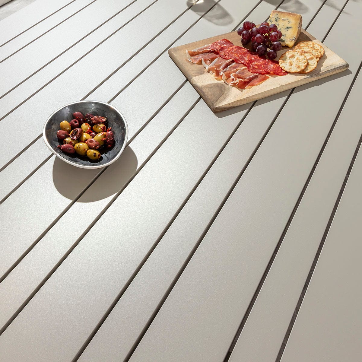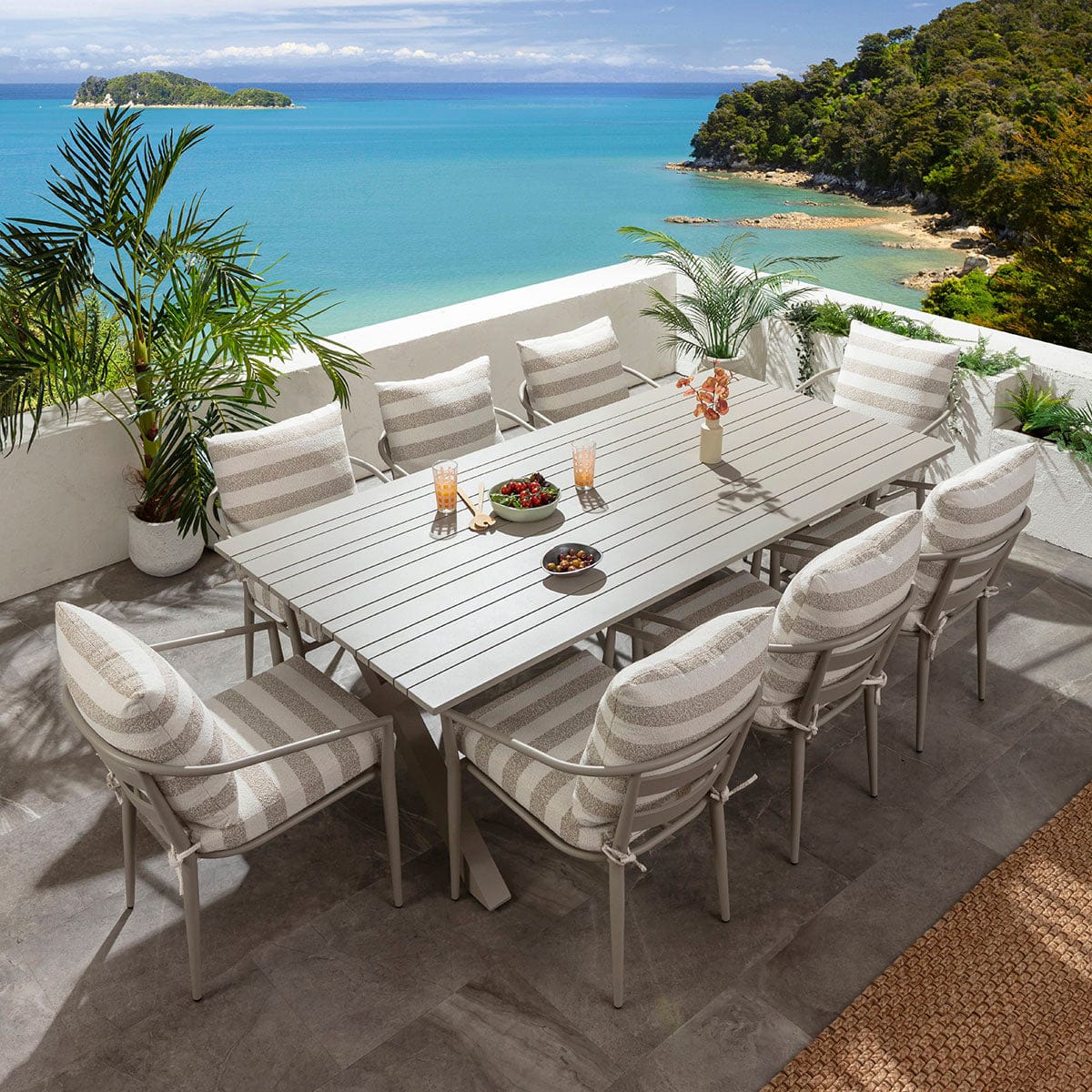 Upgrade your space with this modern 8 seater garden dining table in crushed-almond grey, designed for stylish summer living. Ideal for a garden dining set, this modern outdoor dining table comfortably seats eight. A generous large patio table, it functions beautifully as part of a contemporary outdoor dining set, creating an inviting setting for relaxed entertaining.