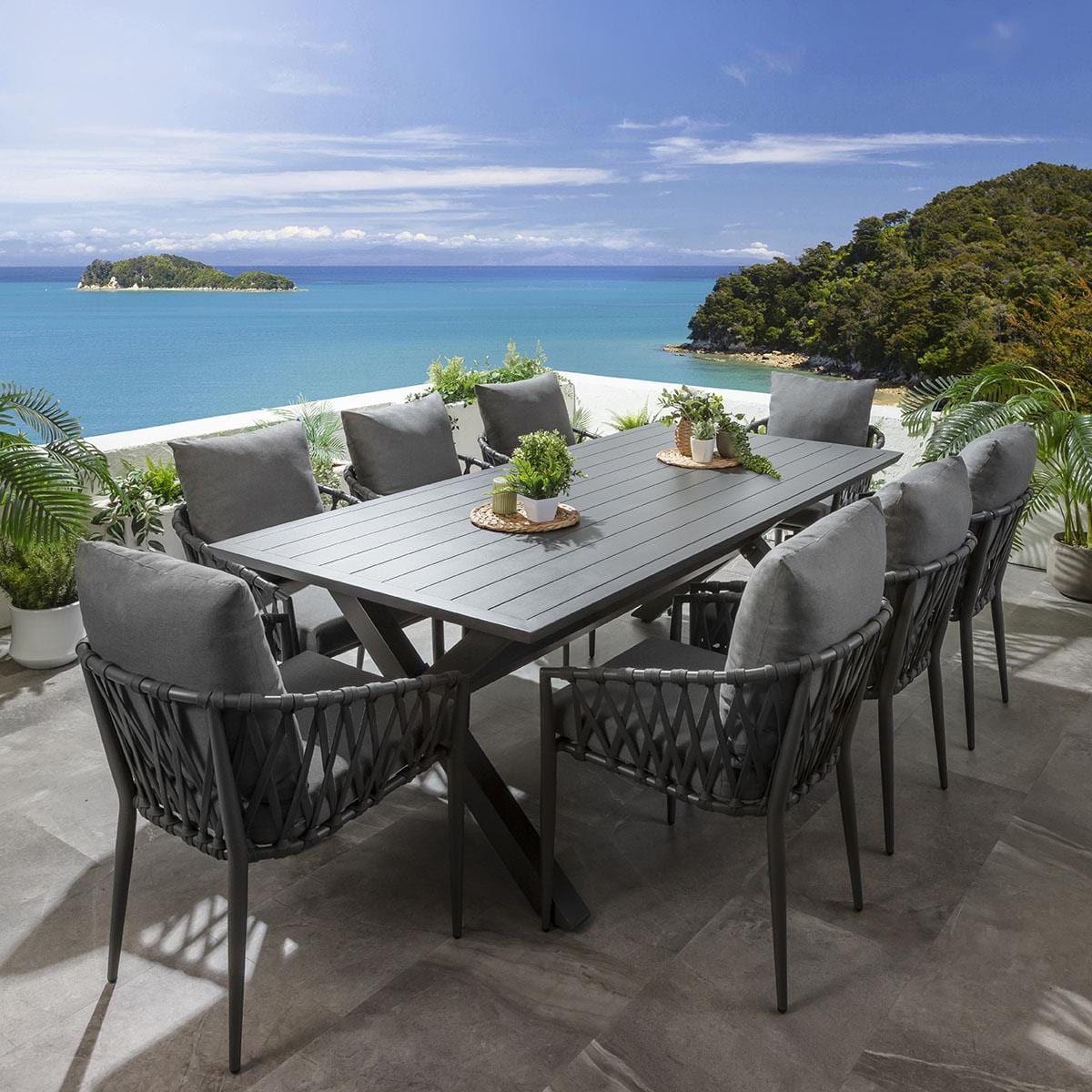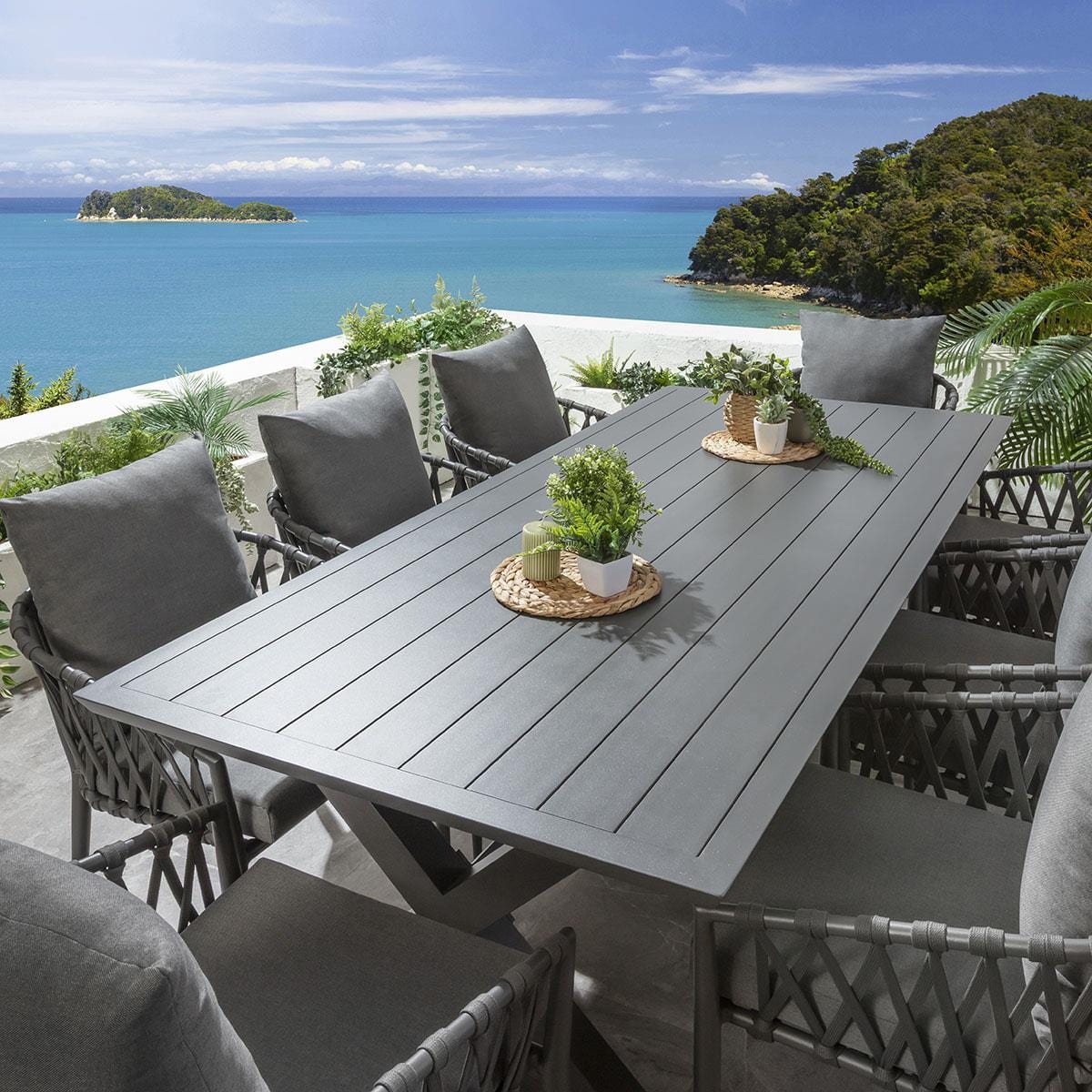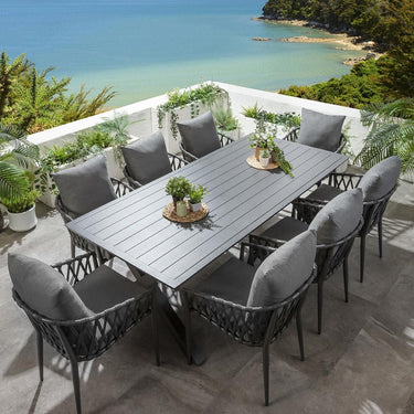 This 8 seater garden dining table and chairs set includes a farmhouse-inspired dining table, featuring a grey finish and X-legs, crafted from full aluminium, with grey rope garden dining chairs made from aluminium, making them weather-resistant for outdoor use. This outdoor dining set is crafted for durability and comfort.