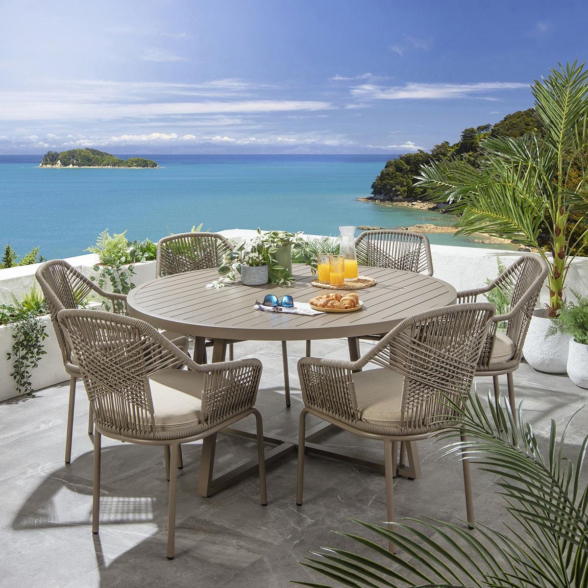 This 6 seater garden table and chairs set includes aluminium garden dining chairs with an intricate rope weave and a seat cushion in a beige fabric, with a round full aluminum dining table in a premium beige finish and it's simple, modern aesthetic. This outdoor dining set is crafted for durability and comfort.