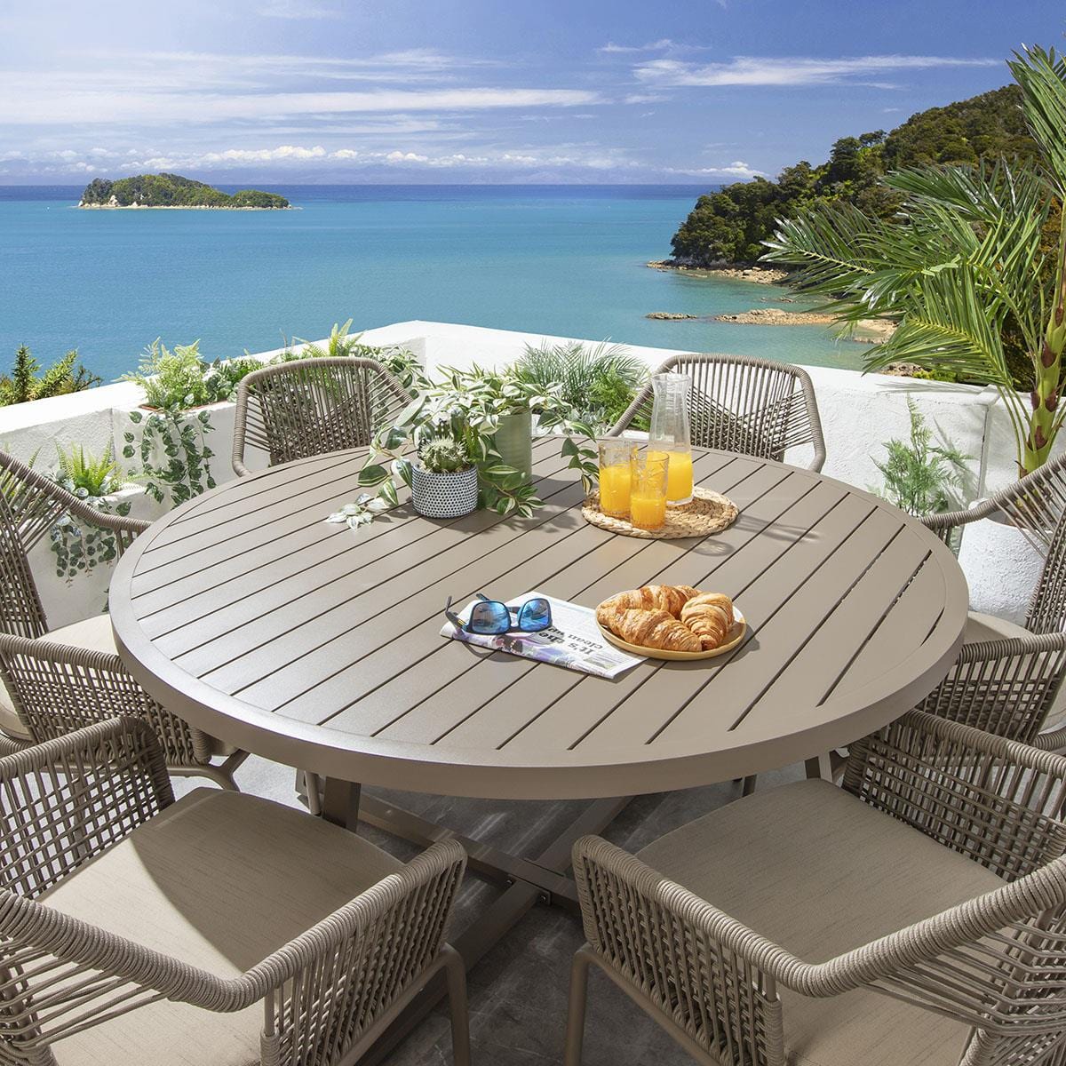 This 6 seater dining set combines modern Cia chairs with the stunning Sun table. Whether you love the Cia chairs and would like to purchase them individually, or you think the Sun table would complete your outdoor decor better with another chair, you can easily mix and match our modern dining tables and chairs to curate something truly unique.