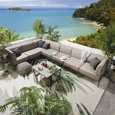 Experience the versatility of the Alfie outdoor modular corner sofa set, comprised of eight pieces, it's a 360cm x 216cm modern garden corner sofa with a coordinating coffee table. Crafted with weather-resistant aluminium frames in an elegant grey finish and super-thick cushions, covered in premium beige fabric.