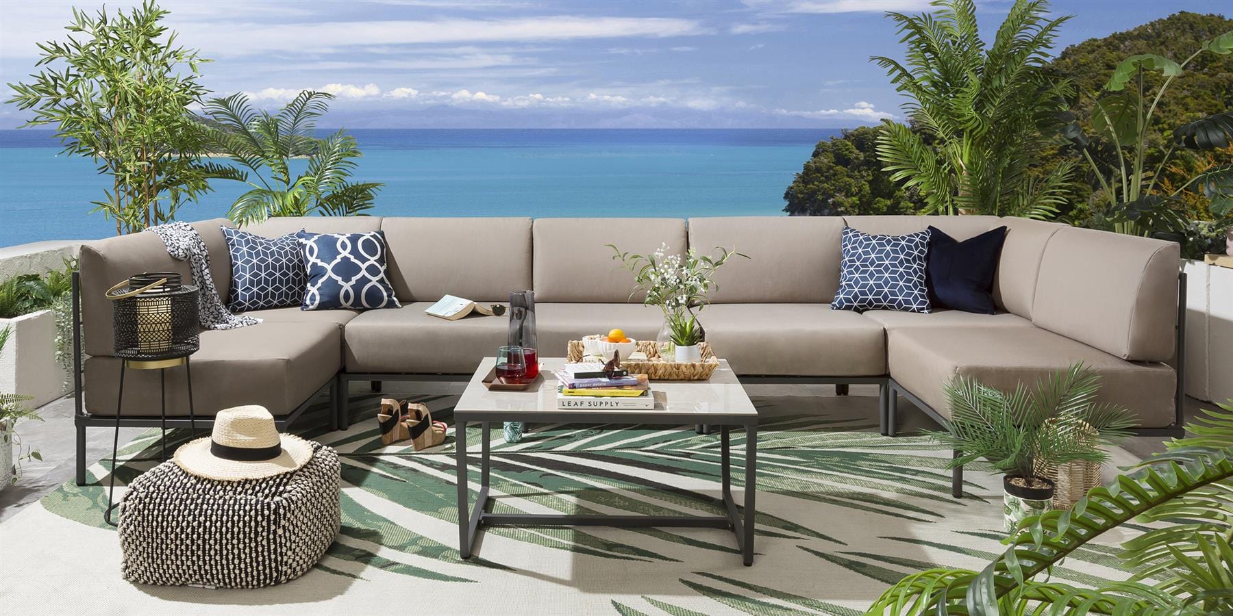 Experience the versatility of the Alfie outdoor modular U-shape corner sofa set, made of eight pieces, it's a 360cm x 144cm modern U shape garden sofa with a coordinating coffee table. Crafted with weather-resistant aluminium frames in an elegant grey finish and super-thick cushions, covered in premium beige fabric.