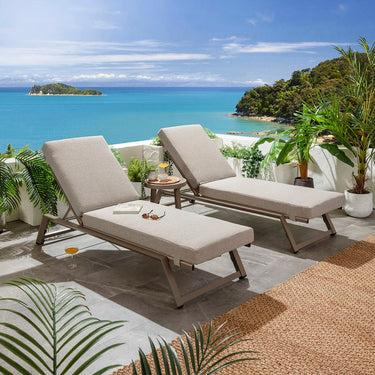 The Cayman sun loungers in latte cream deliver a modern garden lounger experience, combining aluminium outdoor lounger durability with textilene comfort. This set of 2 aluminium sun loungers offer breathable support and a premium sunlounger finish, designed for year-round use, refined aesthetics, and dependable relaxation in any outdoor setting for lasting comfort and visual appeal.