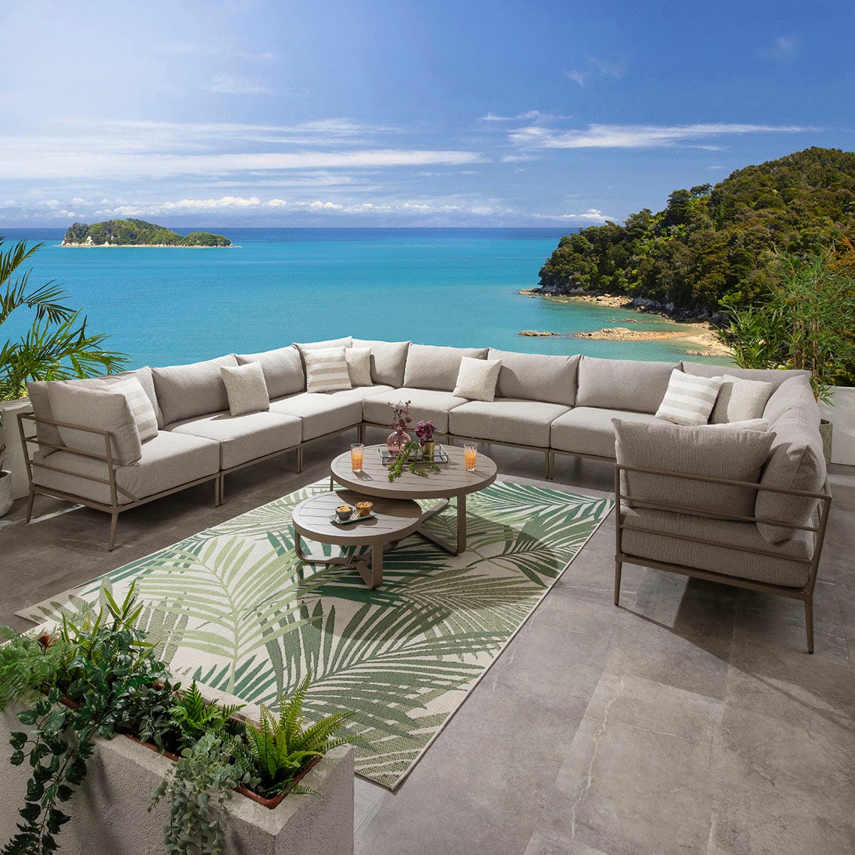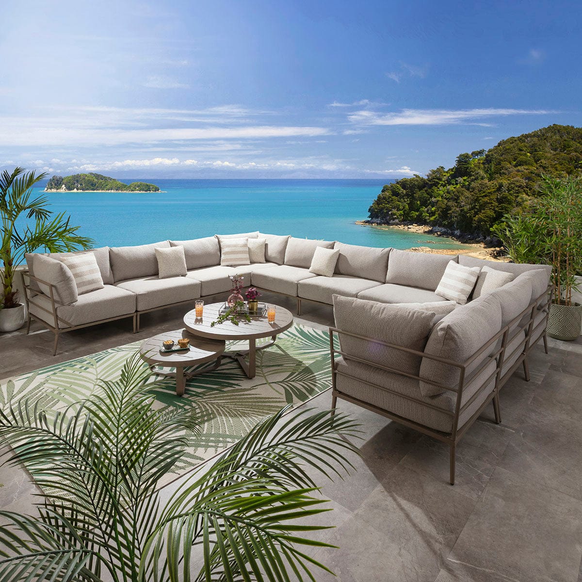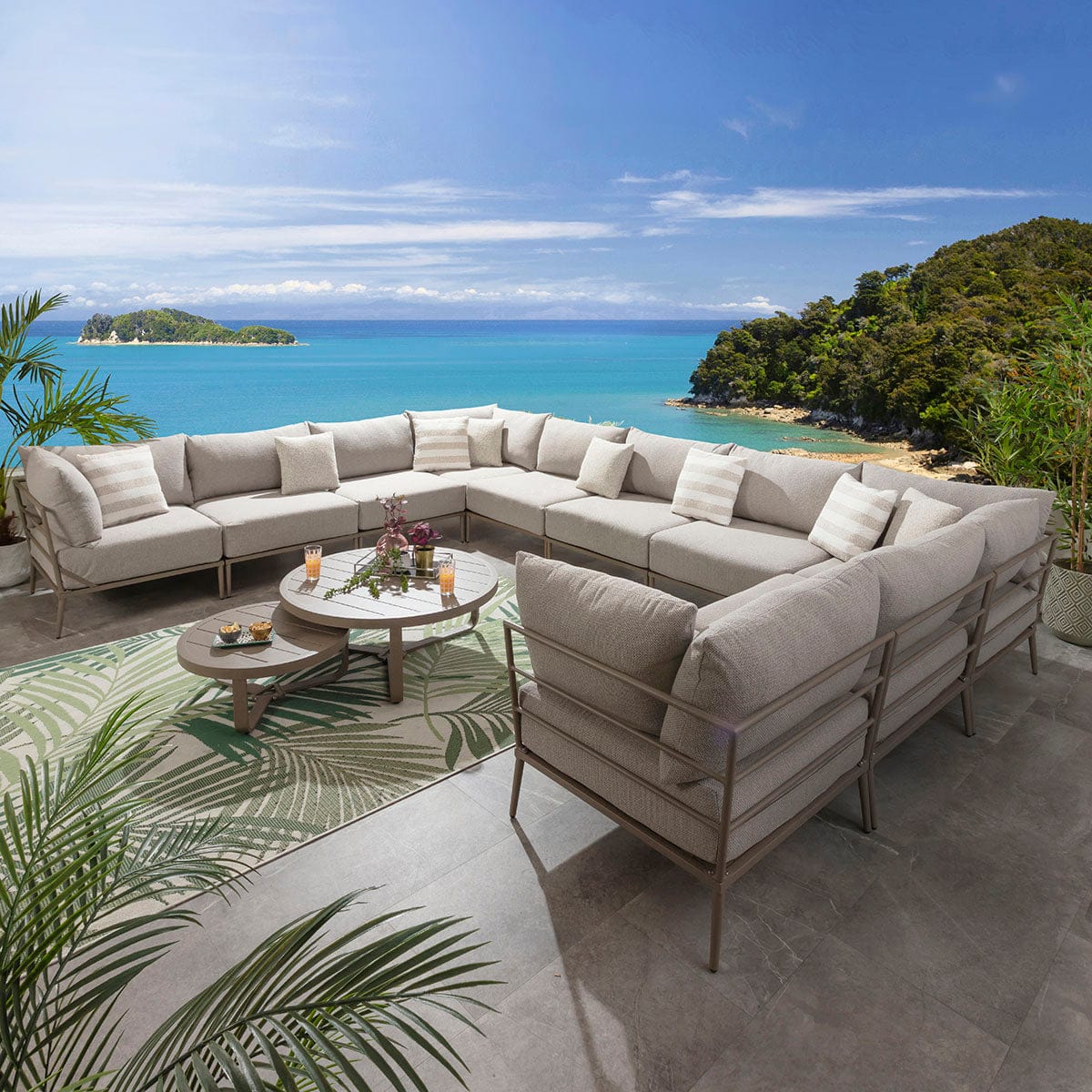 This large modular outdoor U-shape corner sofa in latte cream delivers a refined balance of comfort, scale, and durability for contemporary spaces. Designed as a modern garden corner sofa with modular flexibility, it adapts effortlessly to stylish outdoor spaces of all sizes. Featuring aluminium construction and generous cushioning, this U-shaped garden sofa elevates patios with the presence of a luxury garden couch built for lasting outdoor living.
