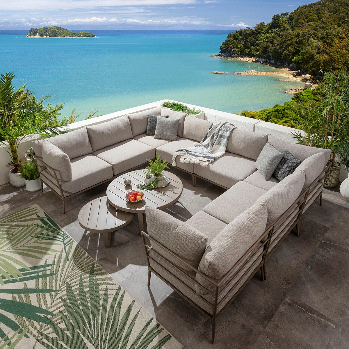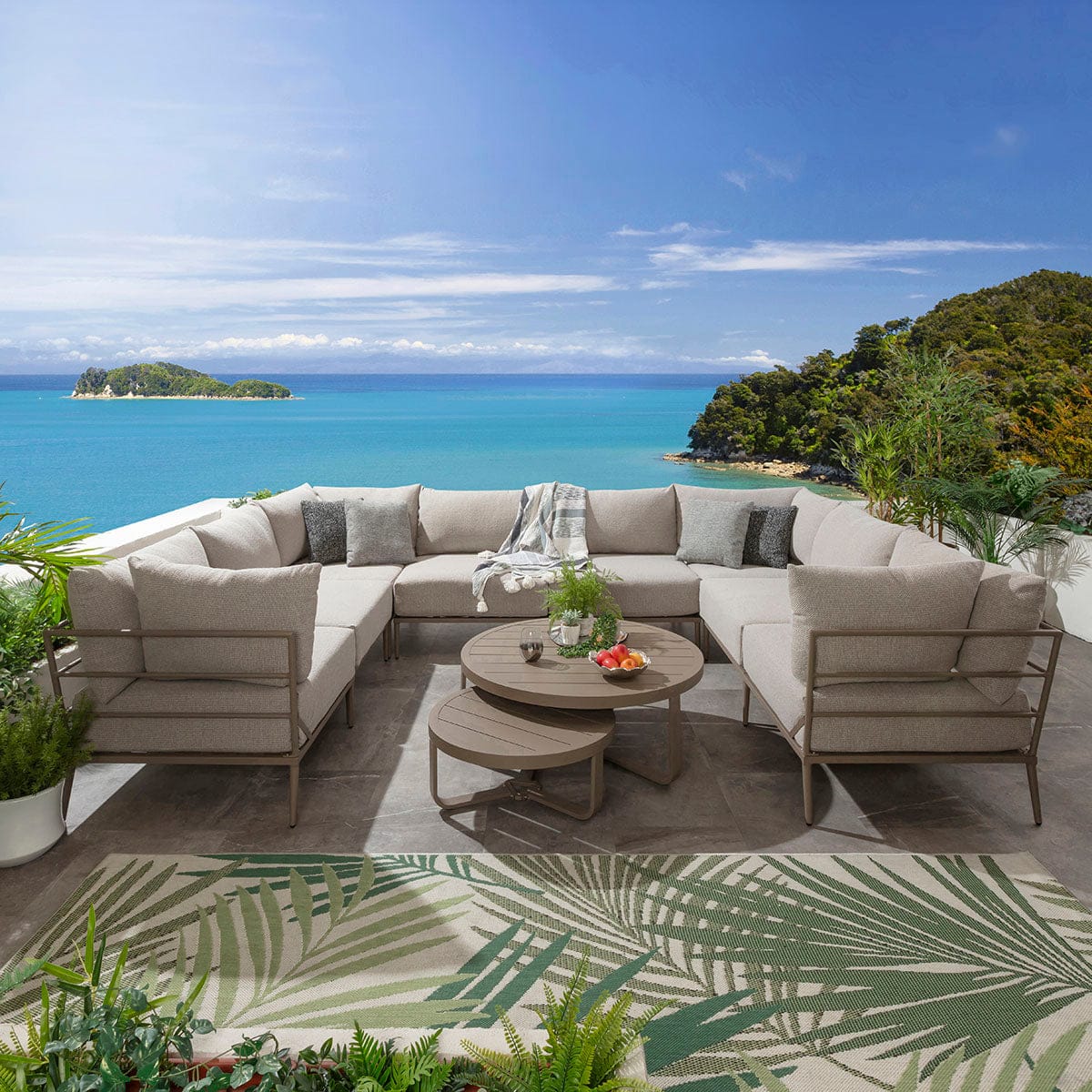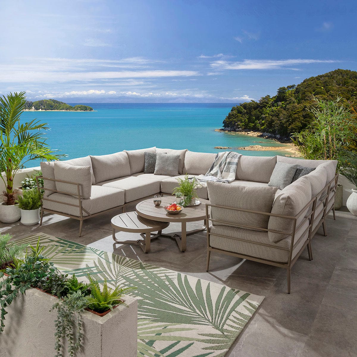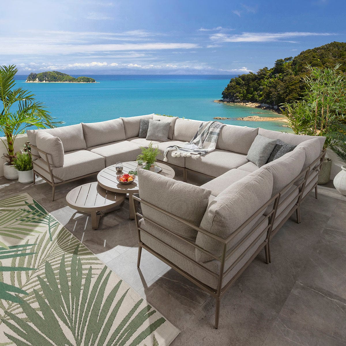 This modular outdoor U-shape corner sofa in latte cream delivers a refined balance of comfort, scale, and durability for contemporary spaces. Designed as a modern garden corner sofa with modular flexibility, it adapts effortlessly to stylish outdoor spaces of all sizes. Featuring aluminium construction and generous cushioning, this U-shaped garden sofa elevates patios with the presence of a luxury garden couch built for lasting outdoor living.