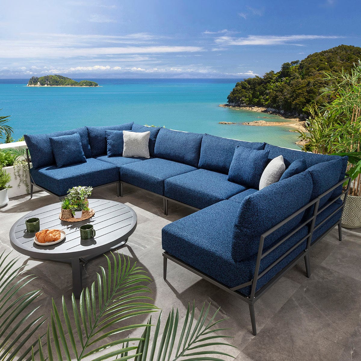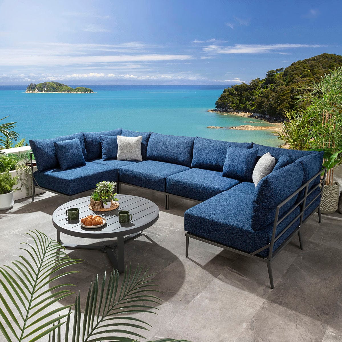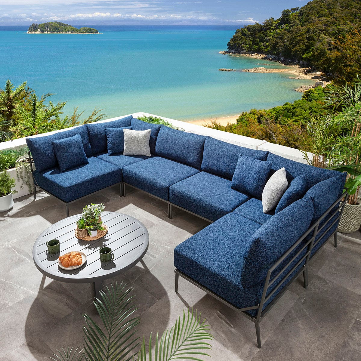 This modular outdoor U-shape corner sofa in midnight blue delivers a refined balance of comfort, scale, and durability for contemporary spaces. Designed as a modern garden corner sofa with modular flexibility, it adapts effortlessly to stylish outdoor spaces of all sizes. Featuring aluminium construction and generous cushioning, this U-shaped garden sofa elevates patios with the presence of a luxury garden couch built for lasting outdoor living.