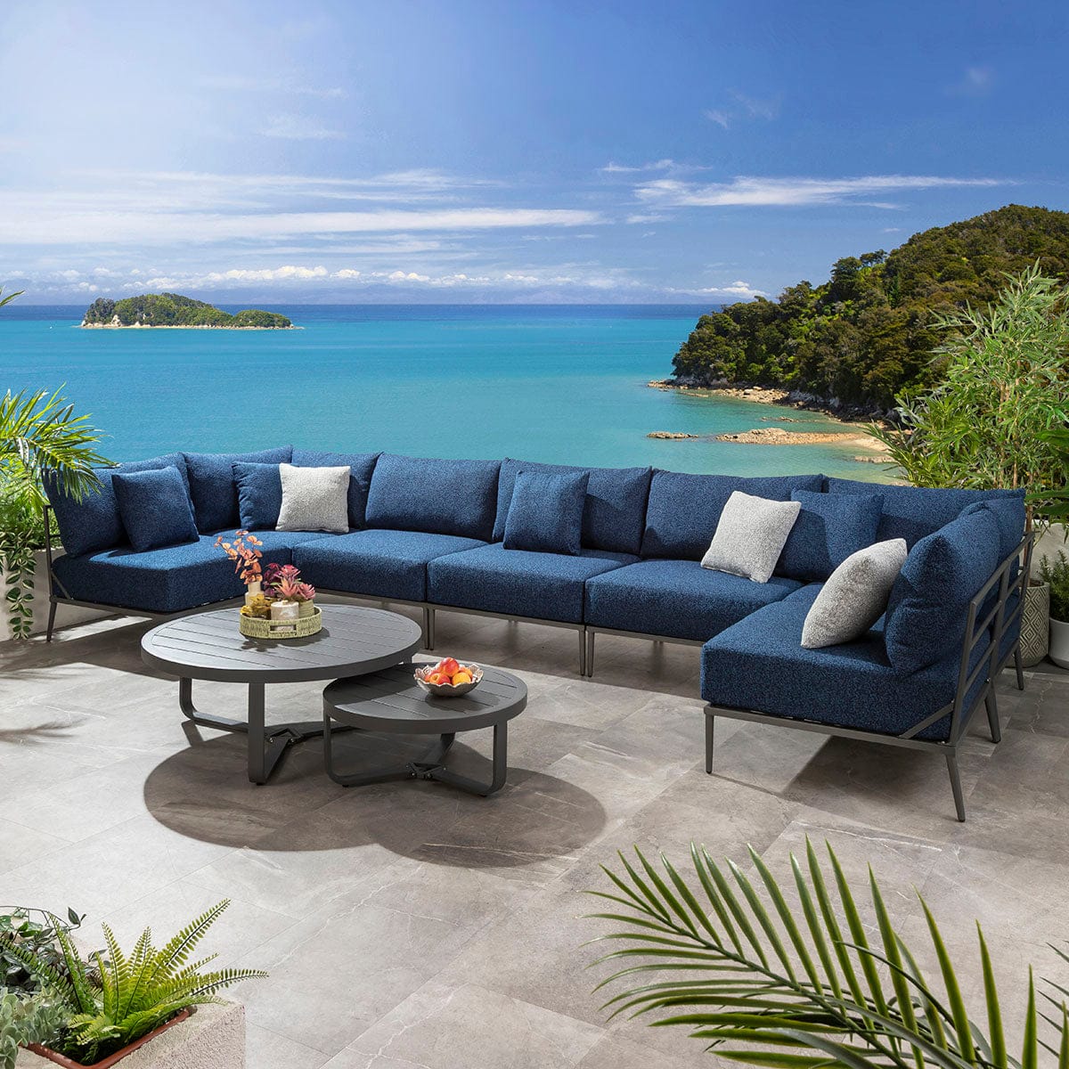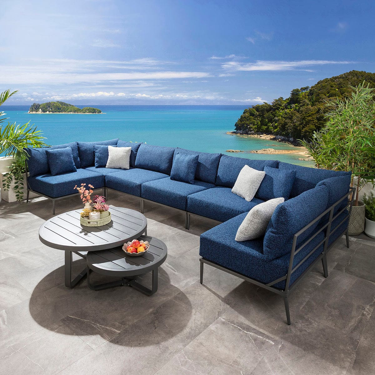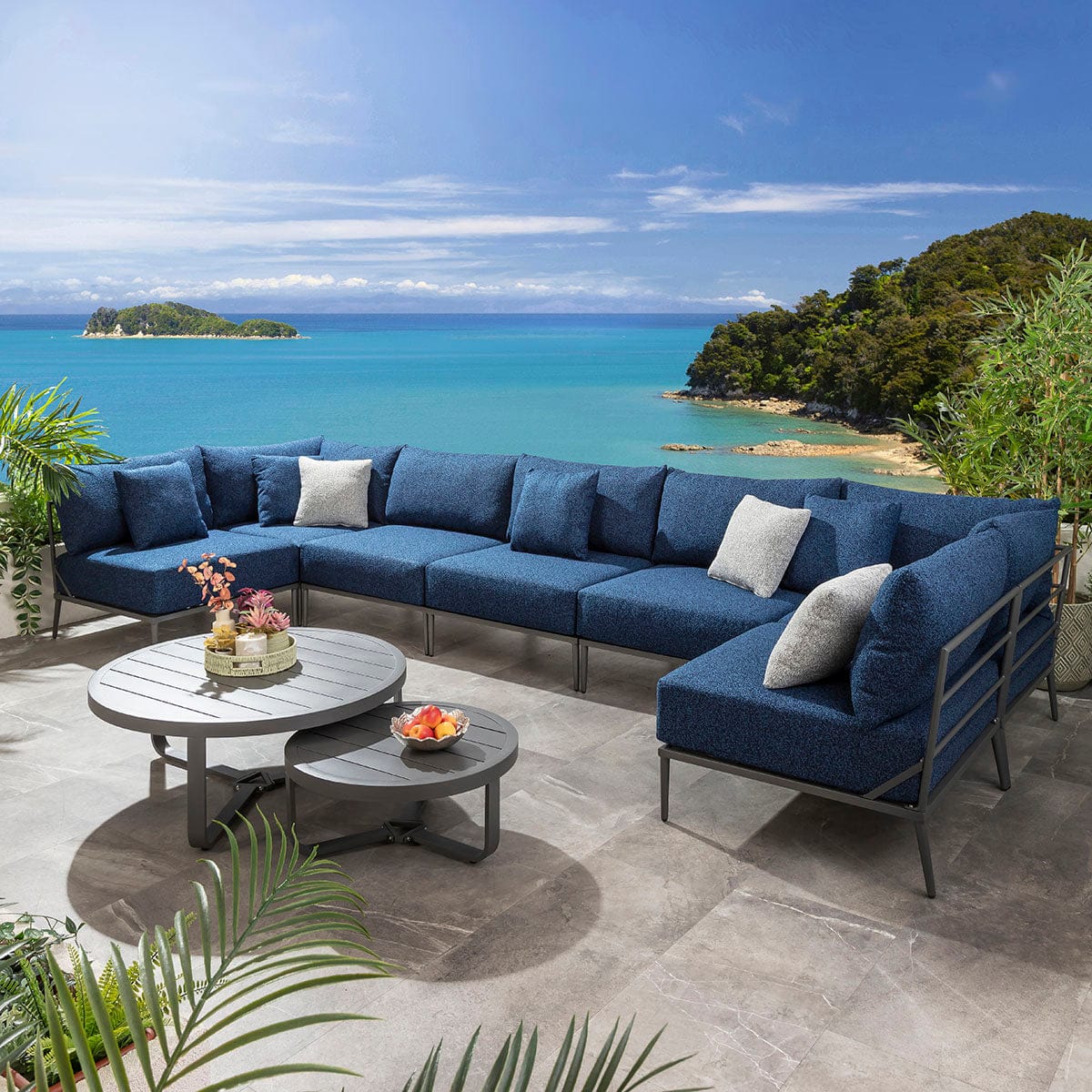 This large modular outdoor U-shape corner sofa in midnight blue delivers a refined balance of comfort, scale, and durability for contemporary spaces. Designed as a modern garden corner sofa with modular flexibility, it adapts effortlessly to stylish outdoor spaces of all sizes. Featuring aluminium construction and generous cushioning, this U-shaped garden sofa elevates patios with the presence of a luxury garden couch built for lasting outdoor living.