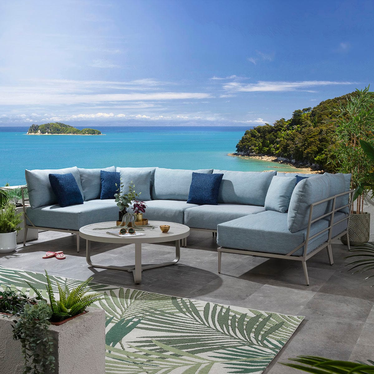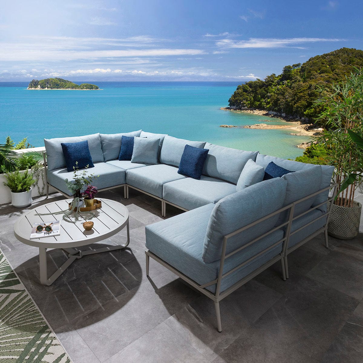 This modular outdoor U-shape corner sofa in sky blue delivers a refined balance of comfort, scale, and durability for contemporary spaces. Designed as a modern garden corner sofa with modular flexibility, it adapts effortlessly to stylish outdoor spaces of all sizes. Featuring aluminium construction and generous cushioning, this U-shaped garden sofa elevates patios with the presence of a luxury garden couch built for lasting outdoor living.