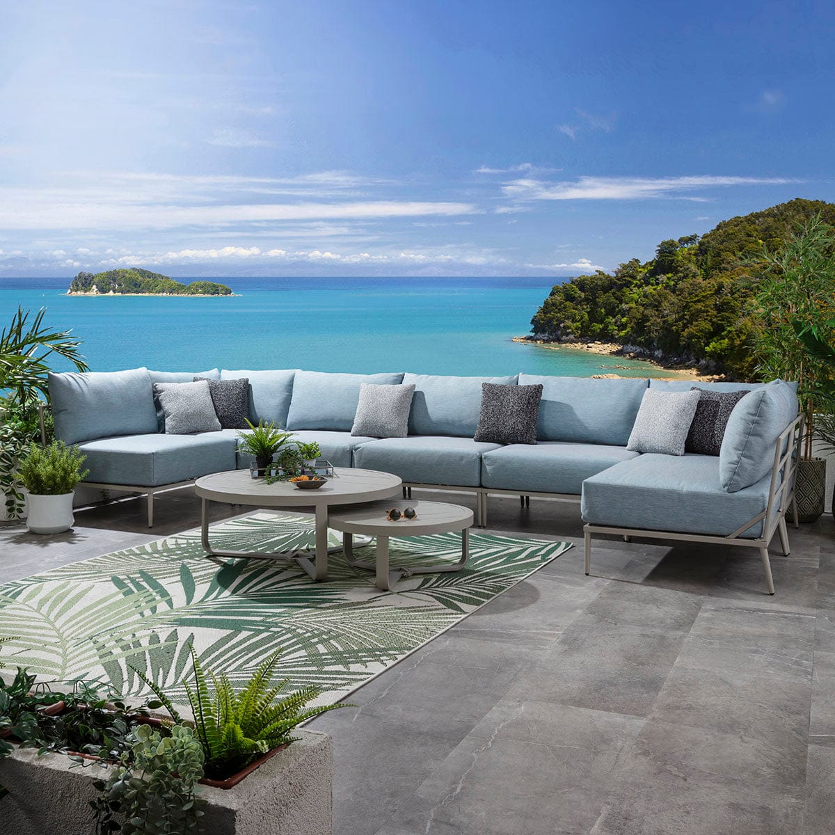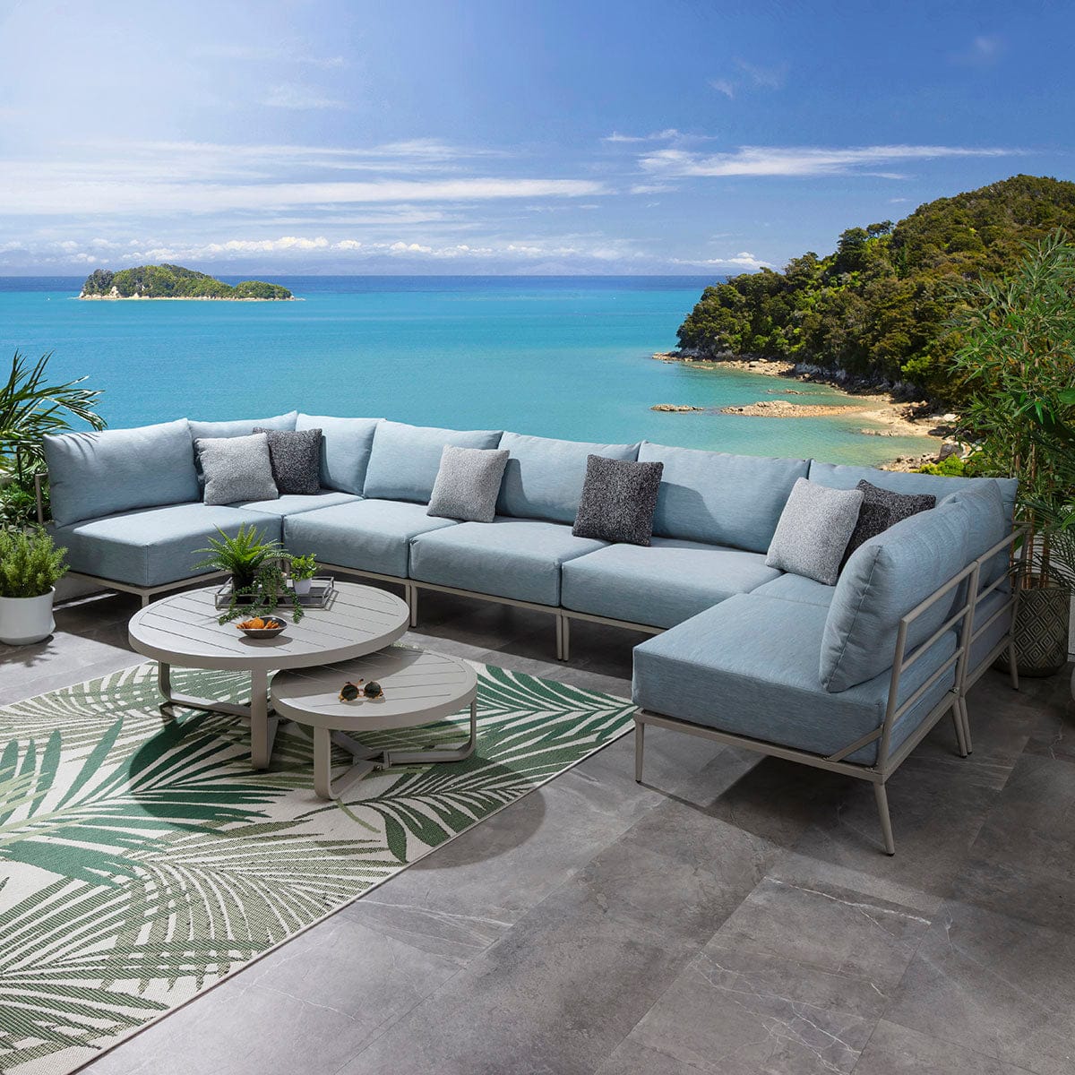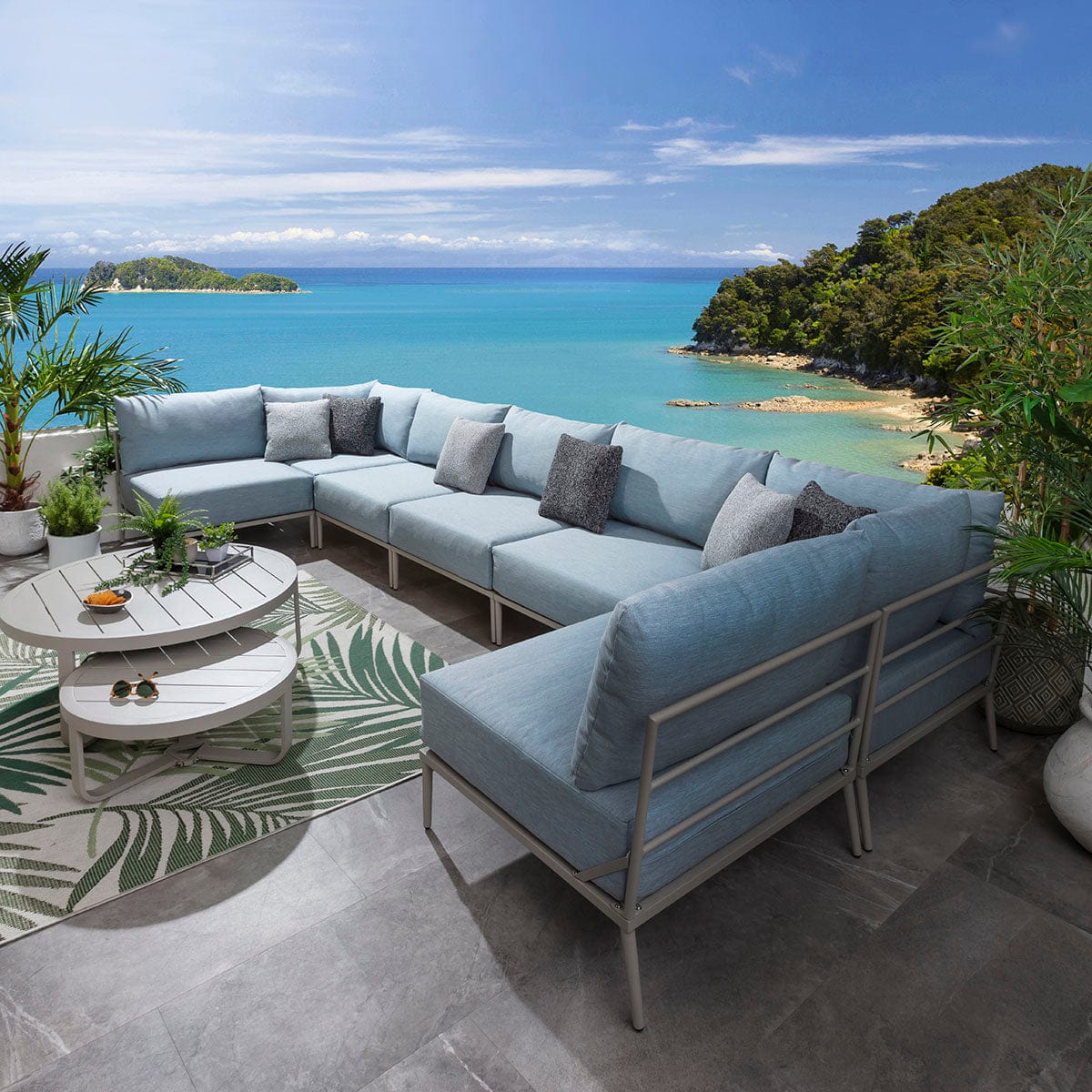 This large modular outdoor U-shape corner sofa in sky blue delivers a refined balance of comfort, scale, and durability for contemporary spaces. Designed as a modern garden corner sofa with modular flexibility, it adapts effortlessly to stylish outdoor spaces of all sizes. Featuring aluminium construction and generous cushioning, this U-shaped garden sofa elevates patios with the presence of a luxury garden couch built for lasting outdoor living.
