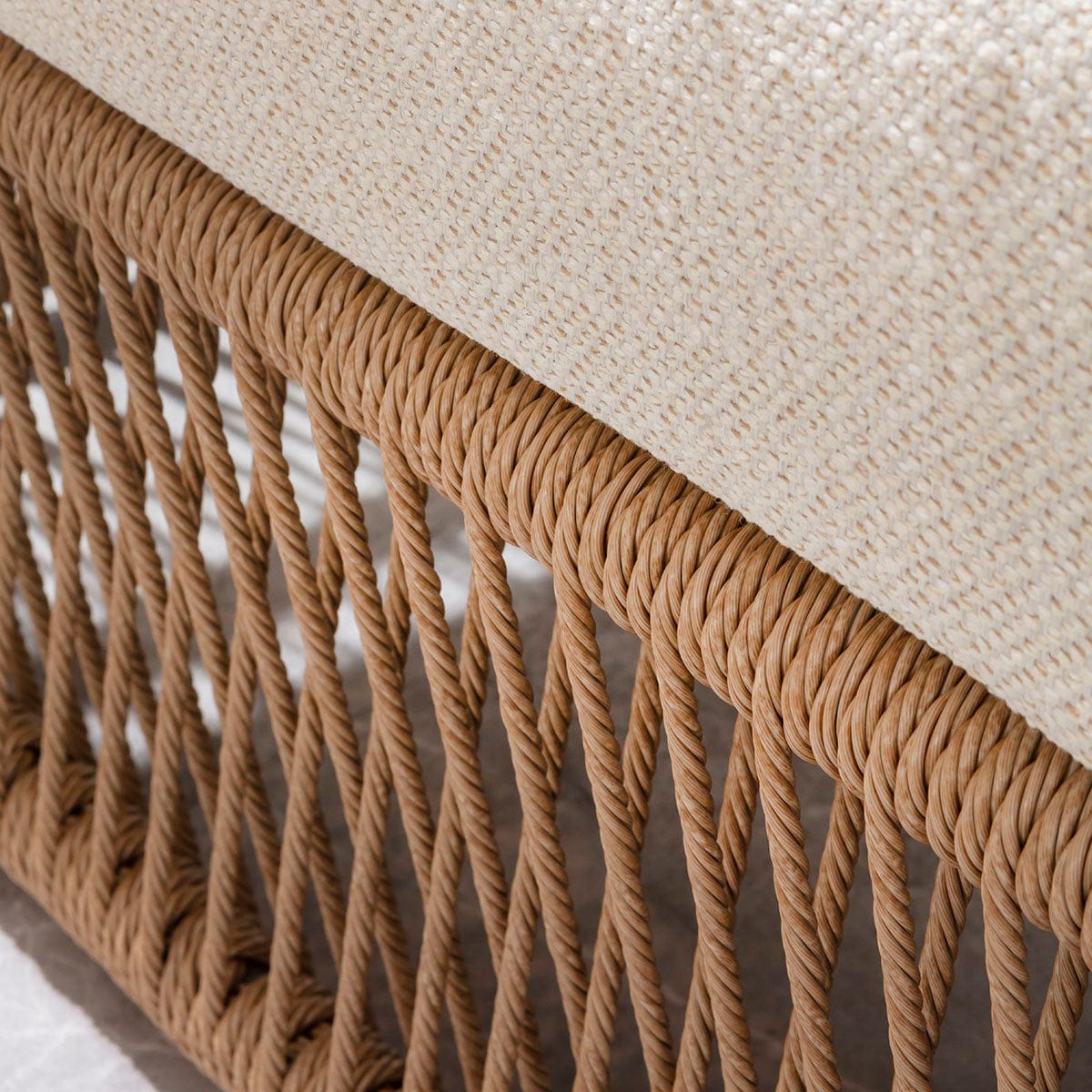 From the Cole collection, this modern sofa blends bold styling with season-ready construction. Slim crushed-almond painted aluminium frames form a durable base, while the intricate outdoor rope weave adds artisanal warmth. High-quality cushions in honey fabric are included for lasting comfort, delivering a comfortable 47cm seat height, with 15cm thick base cushions and 20cm thick supportive back cushions. Storing cushions when not in use is recommended. The footstool can also be used as a coffee table with the included grey marble-effect ceramic top.