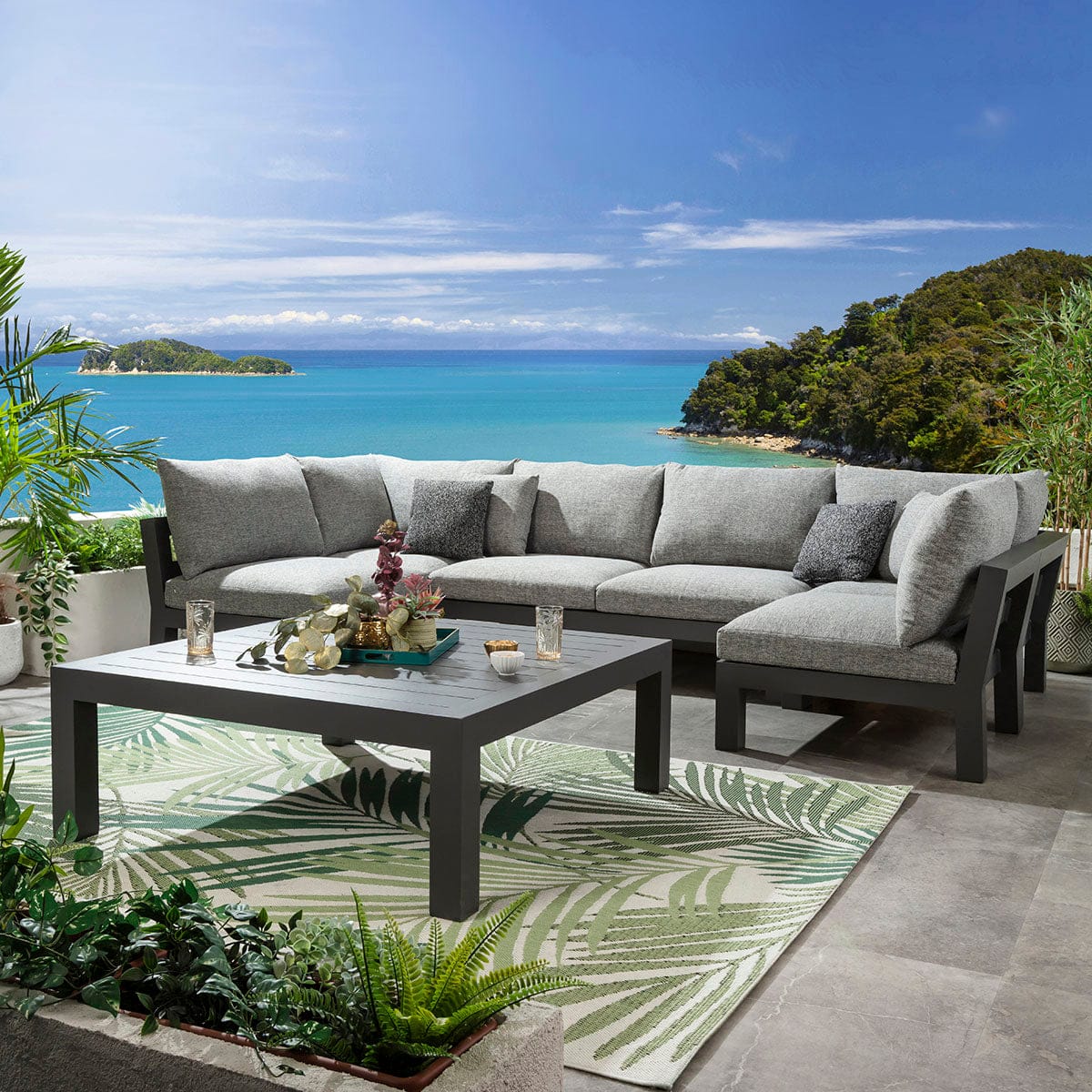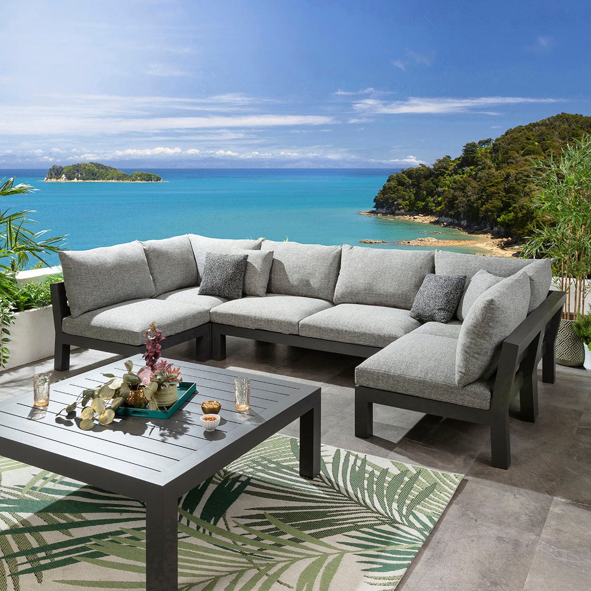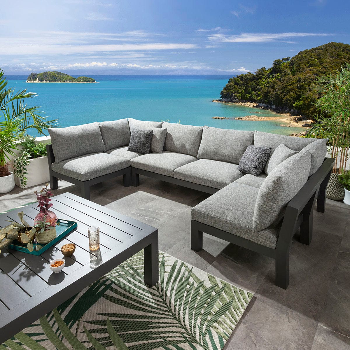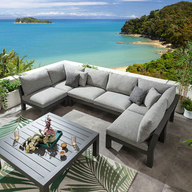 Designed for statement gardens, this U-shape garden corner sofa delivers contemporary comfort at scale. The U-shaped garden sofa layout, aluminium construction, and modular format create a refined grey garden sofa set for entertaining. Combining the presence of a luxury outdoor sofa with the resilience of a metal garden sofa, it redefines the modern outdoor garden sofa experience.