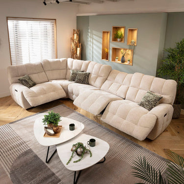 This power recliner sofa is designed as a modular recliner sofa set, with five sections: left and right armed reclining seats, a middle reclining seat, plus a middle and corner unit. Measuring 380cm wide (allow a tolerance of 5cm each way for fabric variation), it is upholstered in premium beige chenille fabric with soft-touch texture. Supportive cushioning ensures long-lasting comfort. Reclining sections require 30cm clearance from the wall. Please note the packaging dimensions - armed sections 117cm x 89cm x 87cm, middle sections 86cm x 86cm x 78cm, corner section 127cm x 105cm x 76cm - which should be considered for delivery and access.