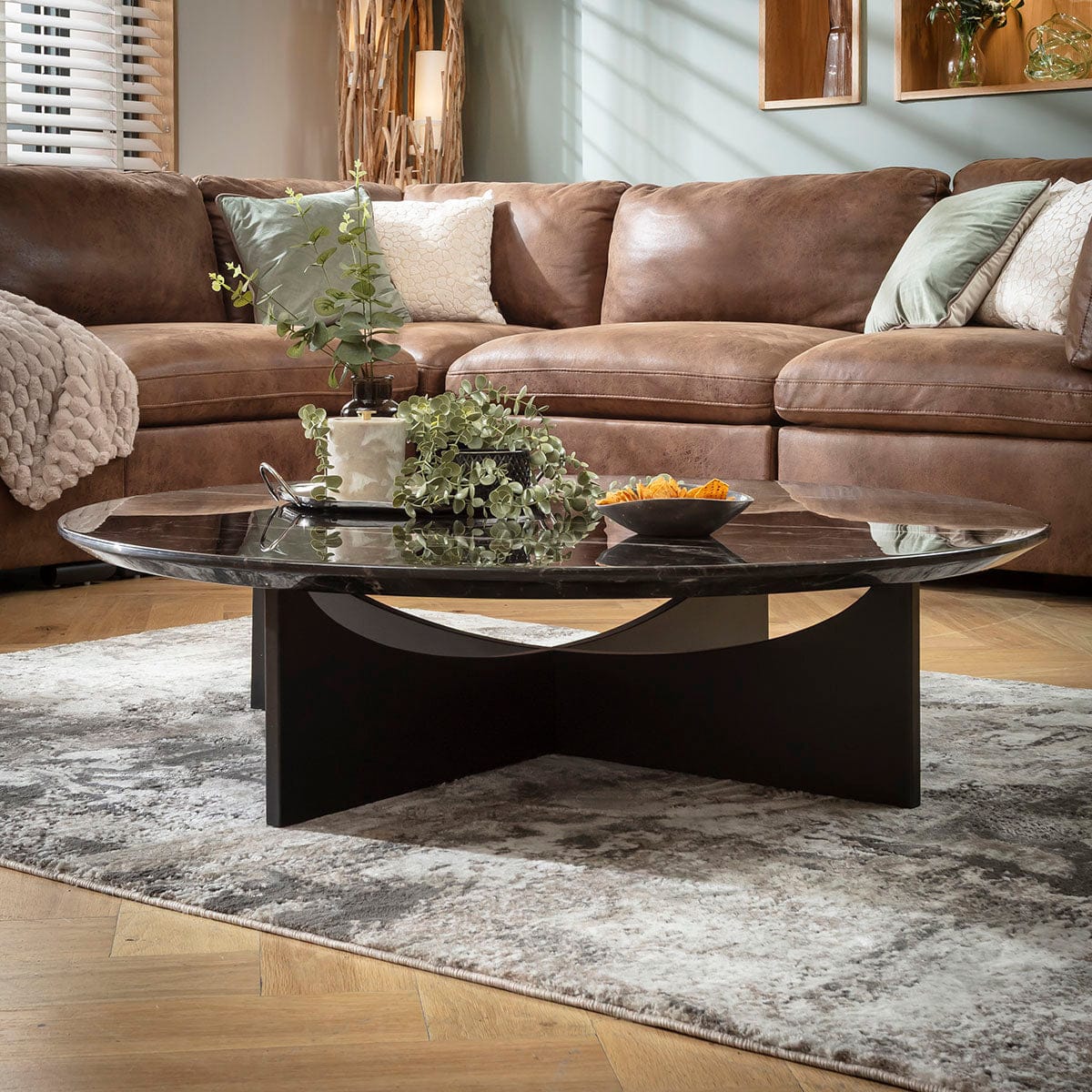 Elevate your living space with this modern round coffee table, a contemporary coffee table designed for style and functionality. This large round coffee table in black features a massive surface and unique base design, combining a polished black marble top with a durable metal base. A big round modern coffee table in black - it’s a statement piece for any room.