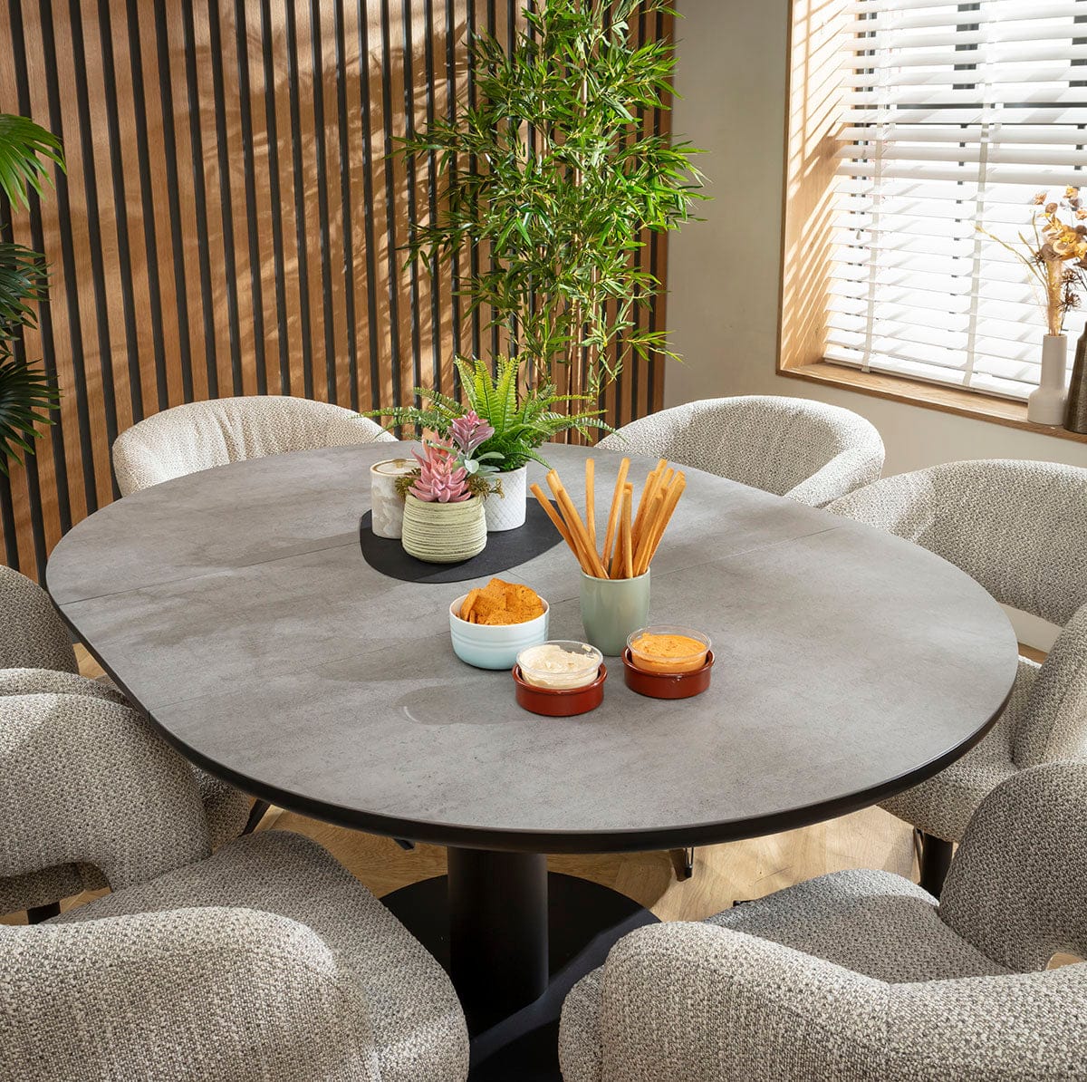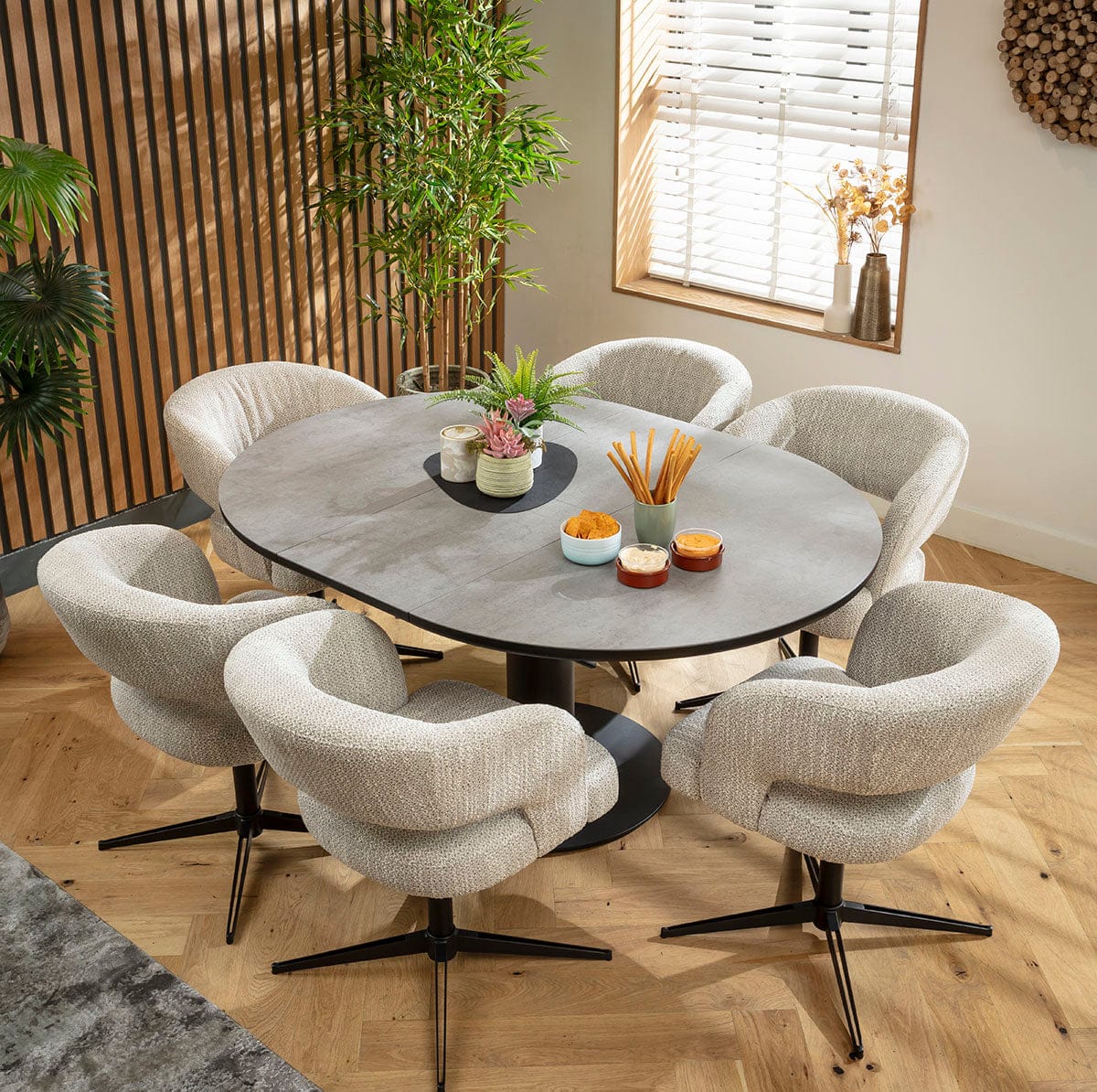 This 6 seater dining table and chair set includes a grey round dining table boasting a stone-effect top that extends into an oval dining table, with modern swivel dining chairs boasting Scandi design and durability in grey woven fabric. This modern dining set is crafted for durability and comfort.