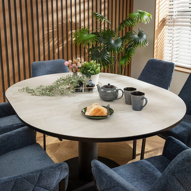 Cora & Venus 6 Seater Round Extendable Dining Set Blue Chenille & Light Grey Ceramic