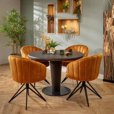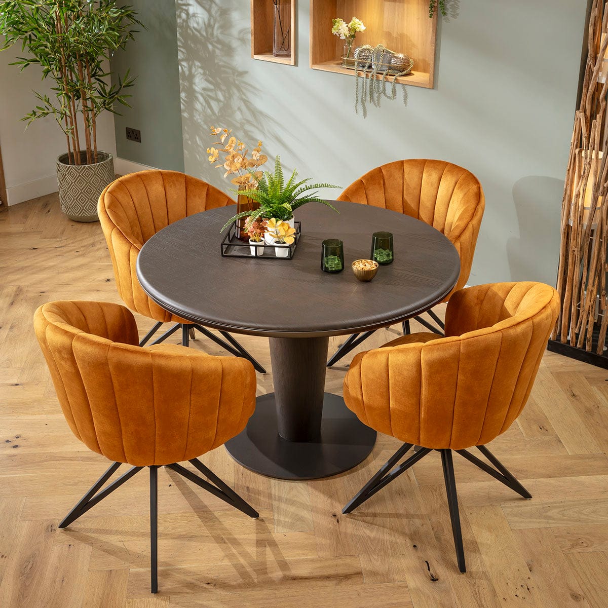 This 4 seater dining table and chair set includes a modern round dining table in grey oak, framed by a sleek space-grey metal rim, with swivel chairs featuring elegant scalloped detailing and wrap-around arms, in rich saffron velvet. This modern dining set is crafted for durability and comfort.