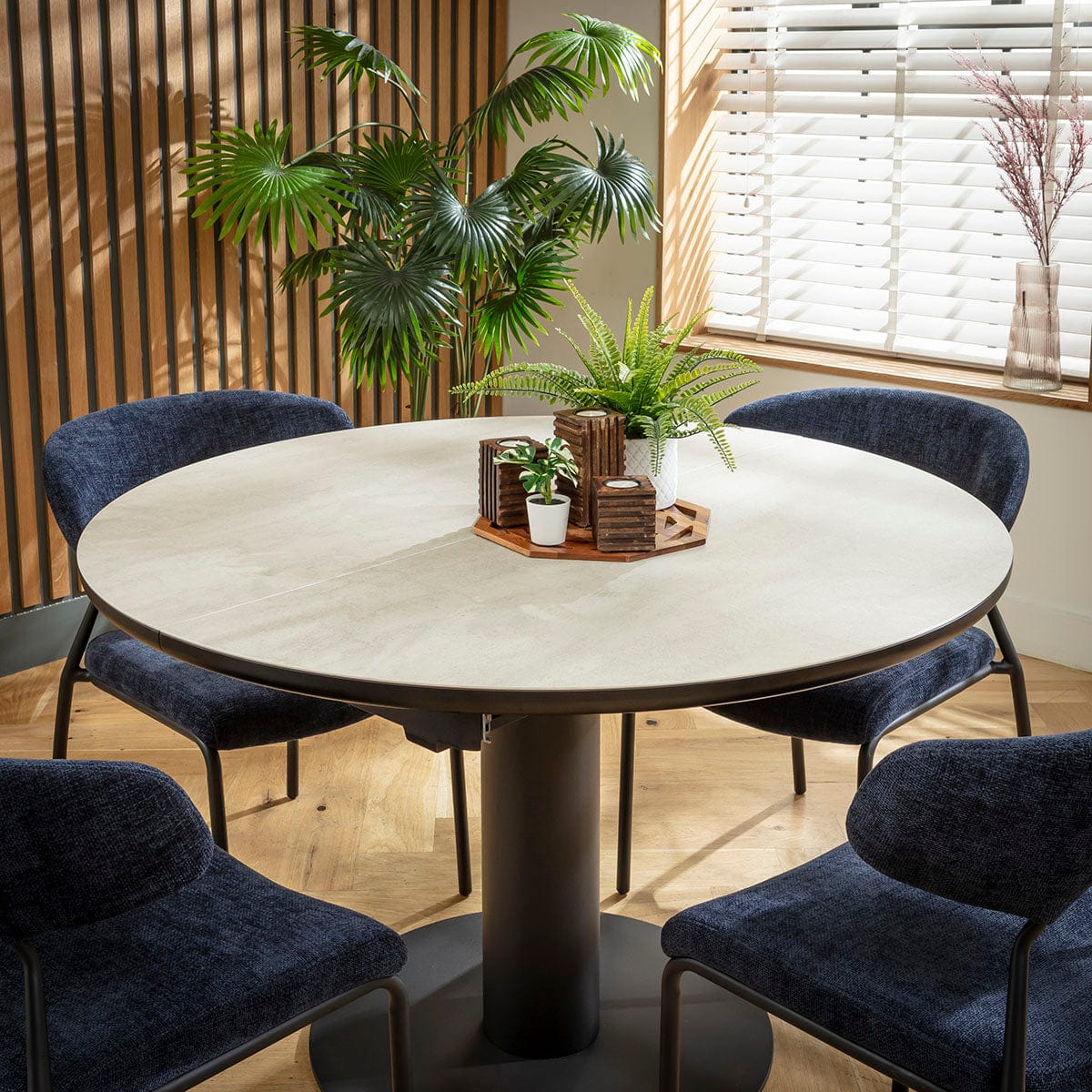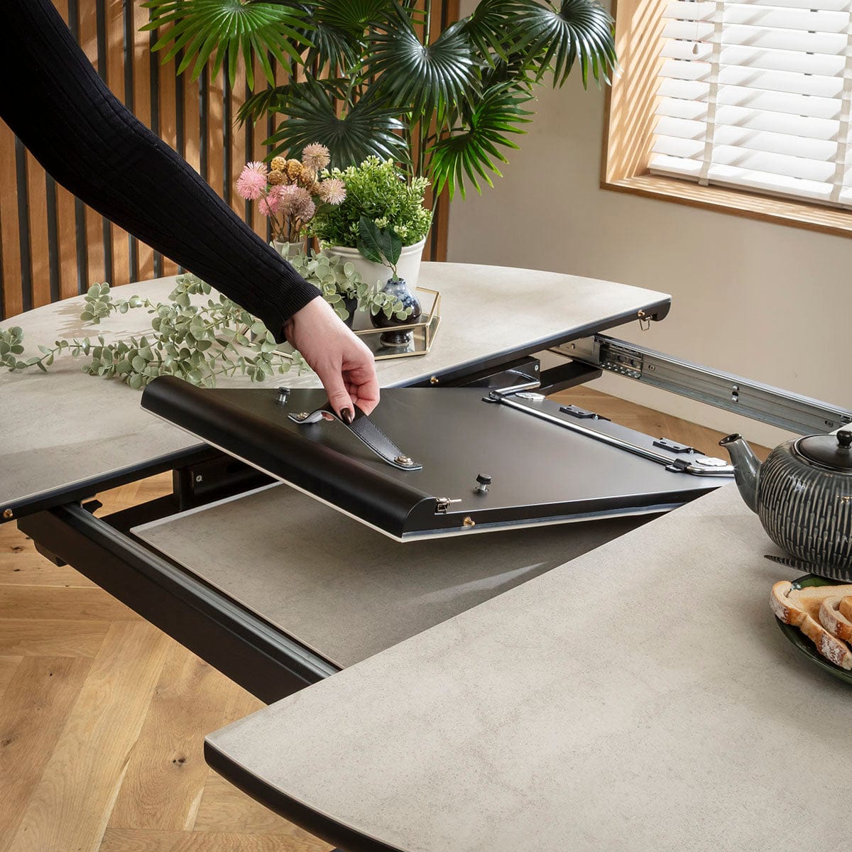 The Venus modern round dining table blends sleek style with everyday practicality. A round extendable dining table, it transforms effortlessly from 120cm to a 160cm x 120cm oval dining table for six. Crafted with a durable light grey stone-effect ceramic top, it’s heat, scratch, and stain resistant, with a slim pedestal stem and black powder-coated base - a stunning round dining room table for contemporary homes. The table features a smart self-stowing leaf hidden beneath the tabletop. Simply unlatch and pull to reveal the handle, unfold the leaf, then push together and lock - extending the dining table in under 30 seconds. Smooth, secure, and designed for effortless everyday use.