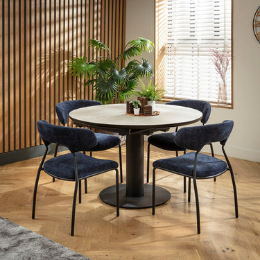 This 4 seater dining table and chair set includes a light grey round dining table boasting a stone-effect top that extends into an oval dining table, with modern dining chairs combining a black metal frame and blue upholstered seat and backrest. This modern dining set is crafted for durability and comfort.