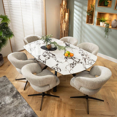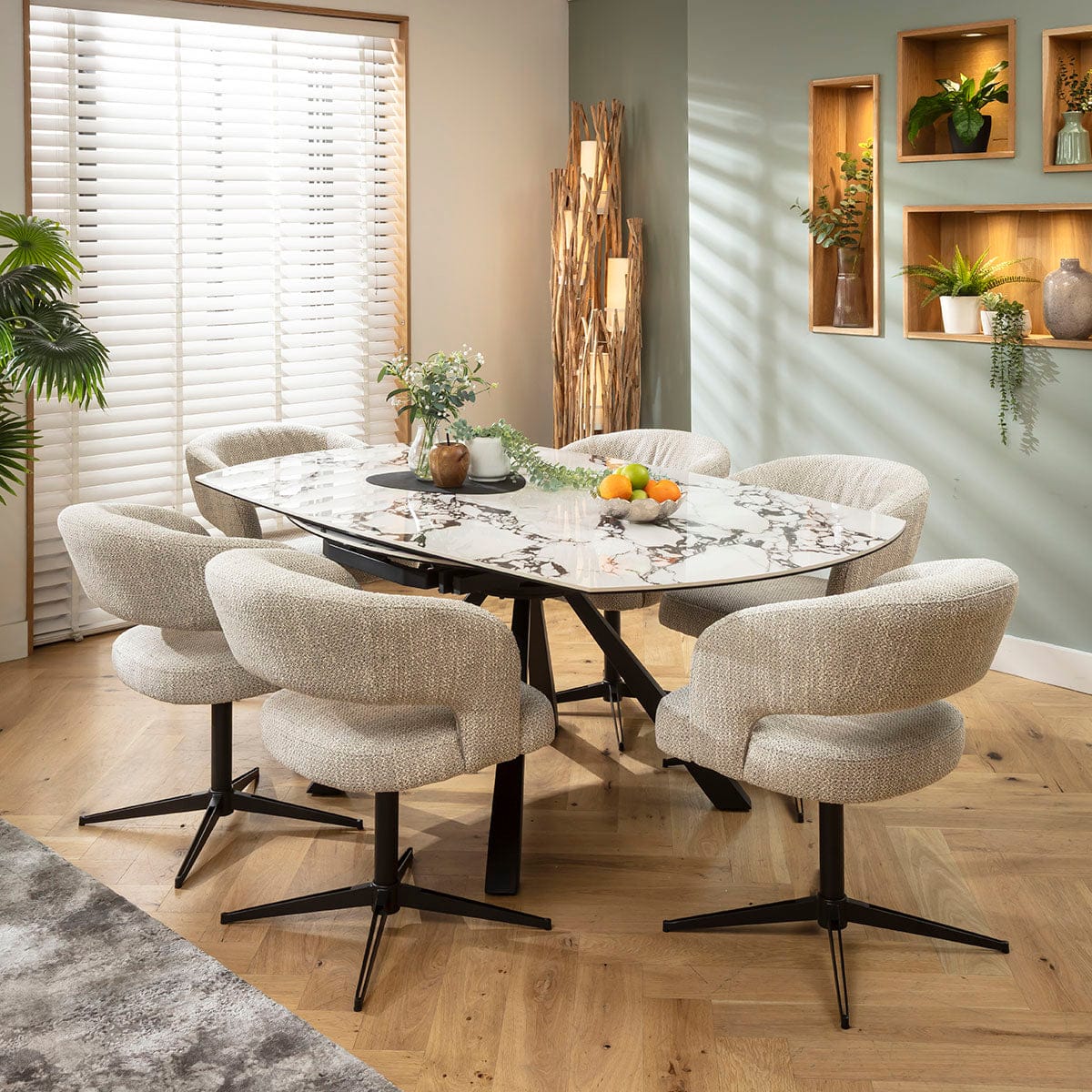 This 6 seater dining table and chair set includes an extendable round dining table boasting a white ceramic top with striking black veining, with modern swivel dining chairs boasting Scandi design and durability in grey woven fabric . This modern dining set is crafted for durability and comfort.
