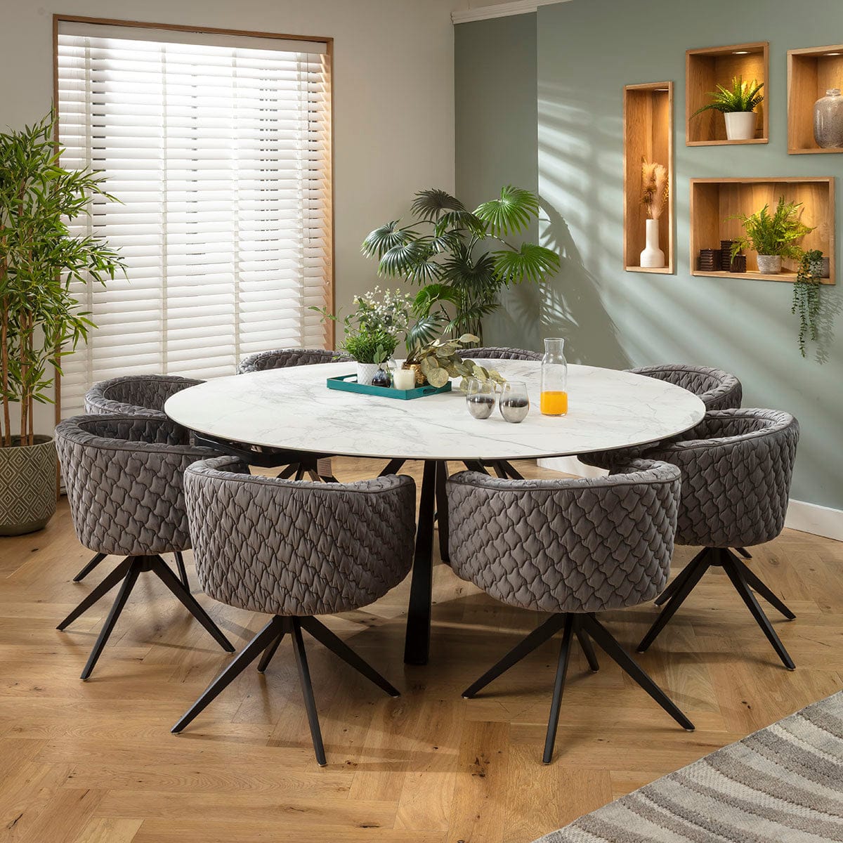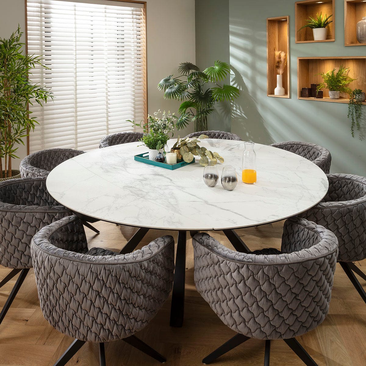 This 8 seater dining table and chair set includes an extendable round dining table boasting a matte white ceramic top with grey veining, with swivel dining chairs with arms for added comfort and mustard velvet upholstery. This modern dining set is crafted for durability and comfort.