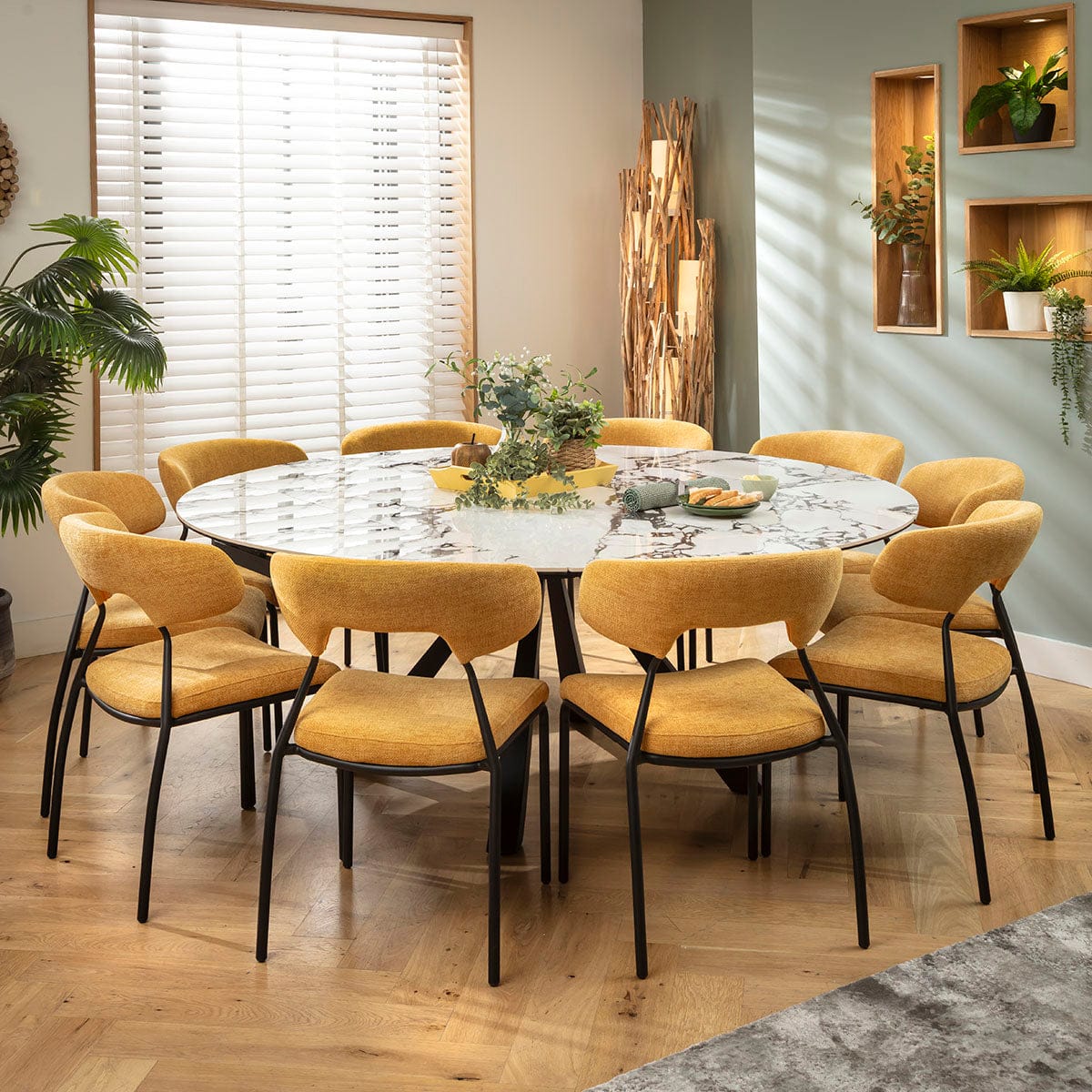 This 10 seater dining table and chair set includes an extendable round dining table boasting a white ceramic top with striking black veining, with modern dining chairs combining a black metal frame and yellow gold upholstered seat and backrest. This modern dining set is crafted for durability and comfort.