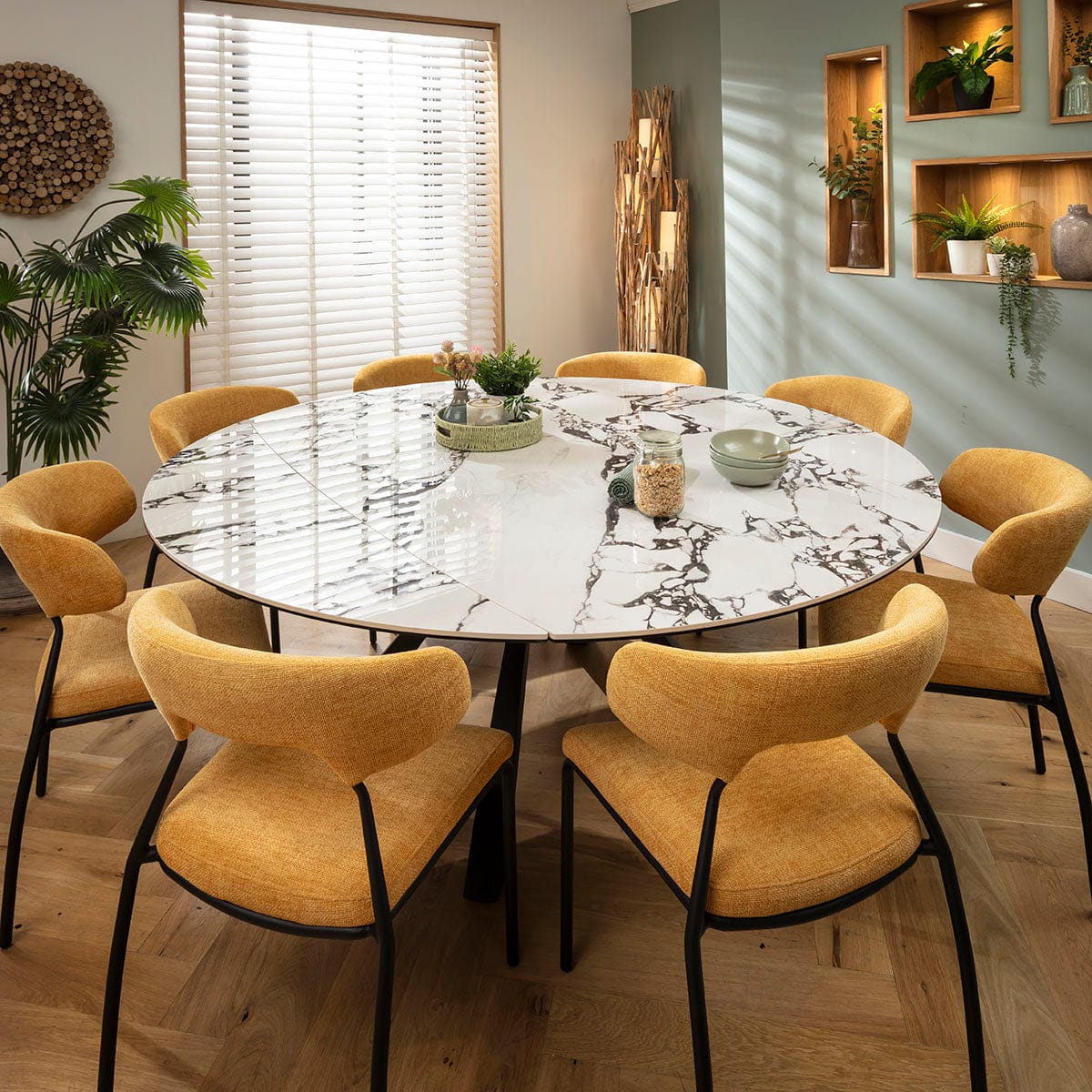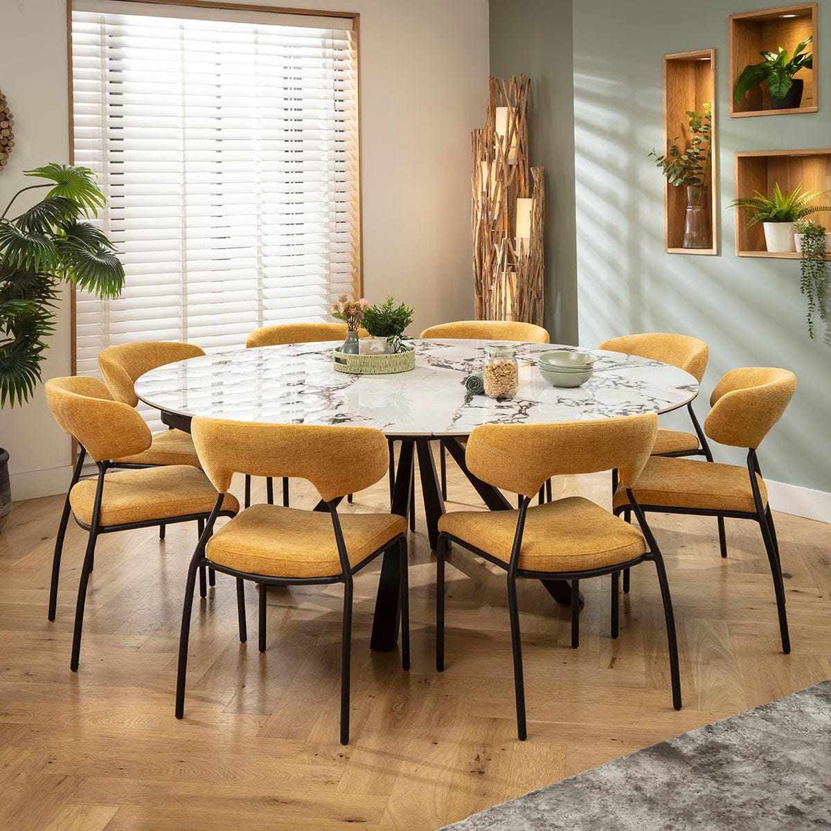 This 8 seater dining table and chair set includes an extendable round dining table boasting a white ceramic top with striking black veining, with modern dining chairs combining a black metal frame and yellow gold upholstered seat and backrest. This modern dining set is crafted for durability and comfort.